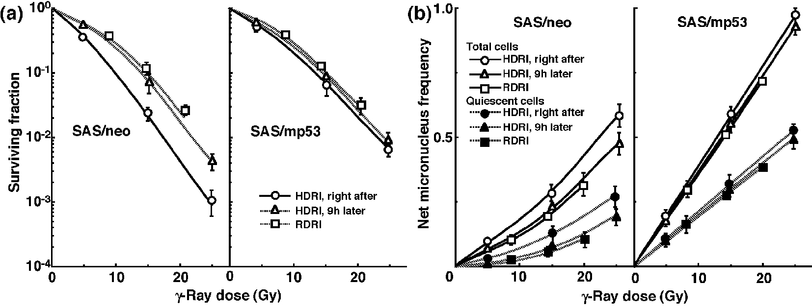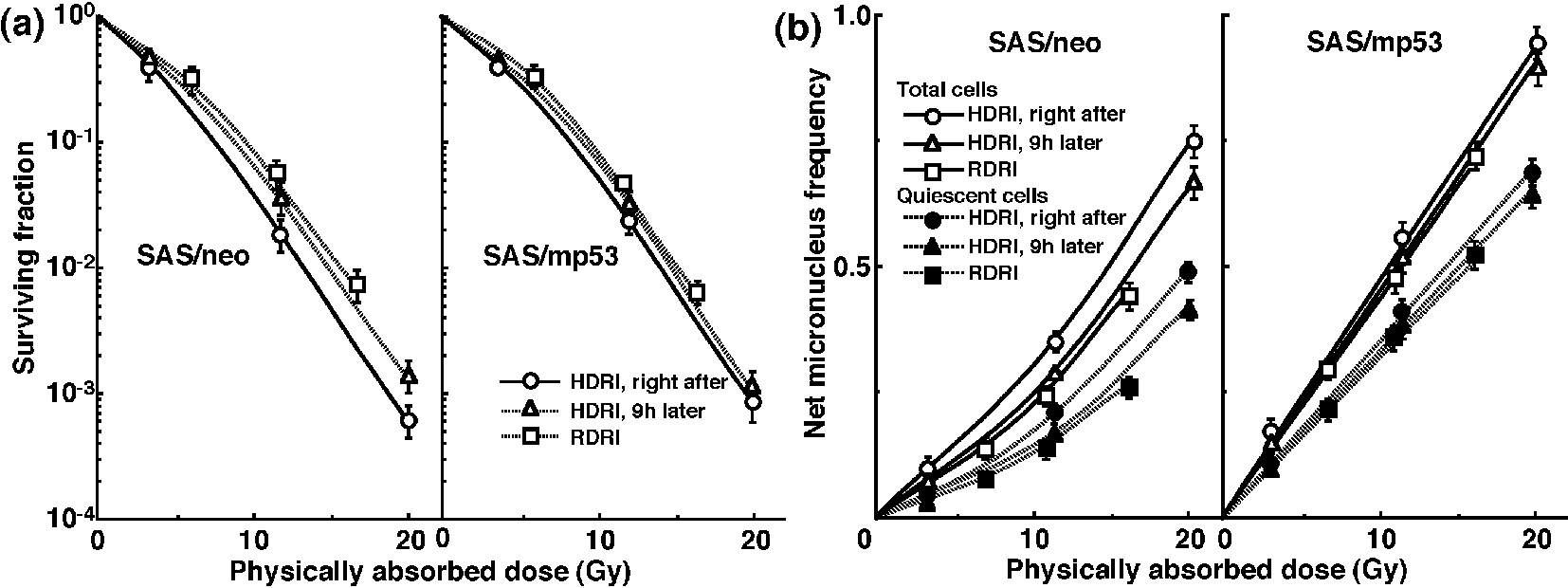 ![]() Click for large image | Figure 2. Surviving fractions and net micronucleus frequencies following accelerated carbon-ion beam (18 MeV/μm) irradiation. The clonogenic cell survival curves for total tumor cell populations and the net micronucleus frequencies for total and quiescent cell populations immediately and 9 h after irradiation using accelerated carbon-ion beams with a linear energy transfer of 18 MeV/μm with high dose-rate irradiation (HDRI) and immediately after irradiation with reduced dose-rate irradiation (RDRI) are shown in (a) and (b), respectively. The left and right panels show SAS/neo and SAS/mp53 tumor cells, respectively. Bars represent standard errors (n = 6). |