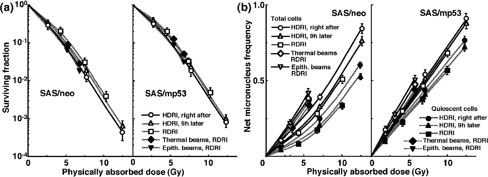 ![]() Click for large image | Figure 3. Surviving fractions and net micronucleus frequencies following accelerated carbon-ion beam (50 MeV/μm) irradiation. The clonogenic cell survival curves for total tumor cell populations and the net micronucleus frequencies for total and quiescent cell populations immediately and 9 h after irradiation using accelerated carbon-ion beams with a linear energy transfer of 50 MeV/μm with high dose-rate irradiation (HDRI) and immediately after irradiation with reduced dose-rate irradiation (RDRI) are shown in (a) and (b), respectively. In addition, the cell survival curves for total cells and the net micronucleus frequencies for total and quiescent cells immediately after irradiation using reactor thermal and epithermal neutron beams are also shown in (a) and (b), respectively. The left and right panels show SAS/neo and SAS/mp53 tumor cells, respectively. Bars represent standard errors (n = 6). |