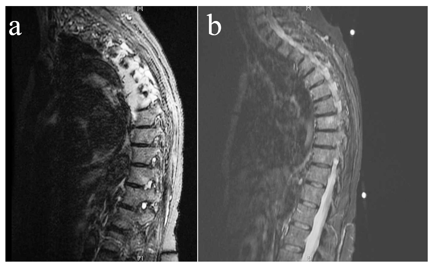 At our hospital, since she was complaining of chest pain, a CT of the chest with contrast, intended to rule out pulmonary embolism, showed bilateral pleural effusions and an increased soft tissue density in the bilateral paraspinal compartment ranging from T4 to T8, which was suspicious for a malignant process. No endobronchial obstruction or pulmonary mass were found. An MRI of the thoracic spine with contrast subsequently revealed multiple foci of bone marrow signal abnormalities suspicious for malignancy, and infiltration of the T4 to T6 vertebral bodies. Extensions into the neural foramens, spinal canal, adjacent ribs, epidural and paraspinal soft tissue were also noted on multiple levels. Additional osseous lesions were found at T7, T8, and T11. Cord compression was pronounced at the level of T4-T5. The tumor had overall progressed and increased in size compared to the prior MRI study done at another facility (Fig. 1a).