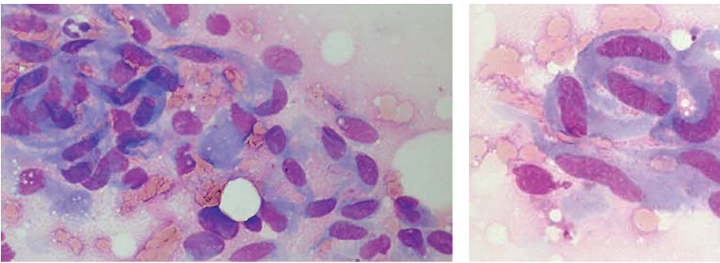 ![]() Click for large image | Figure 1. Fine-needle aspirates of desmoid tumors showing coherent clusters of uniform spindle cells with abundant cytoplasm and oval to elongated nuclei with evenly distributed chromatin. Large, basophilic multinucleate cells representing atrophic muscle fibers are also seen. |