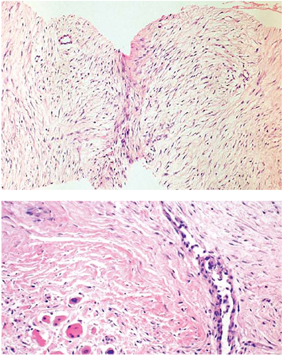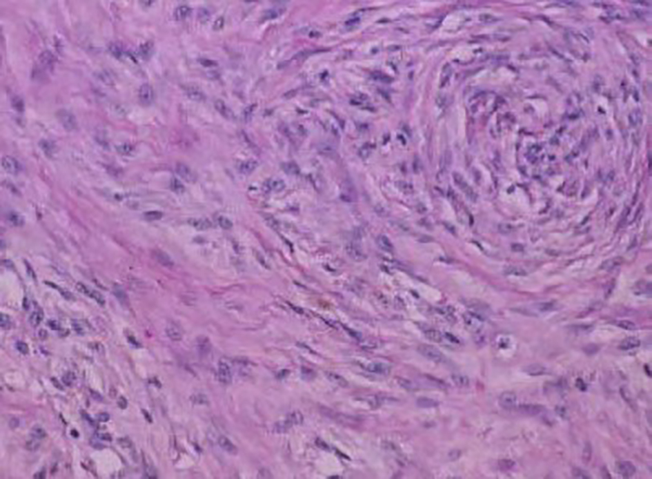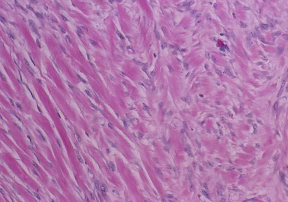 On H&E section, the tumor consists of elongated spindle cells reminiscent of fibroblasts presenting uniform appearance with eosinophilic cytoplasm embedded within a collagenous matrix. The nuclei are small, vesicular, pale staining, and sharply defined, and may contain one or two tiny nucleoli, but lack hyperchromasia. Intra-abdominal desmoids can sometimes contain relatively scanty collagen and a pronounced myxoid matrix. Spindle cells and collagen fibrils are usually arranged in ill-defined fascicles and interlacing bundles (Figs. 3, 4). Occasionally extensive glassy hyalinization, which is also a feature of keloid, may also be encountered. The tumors can vary in cellularity and may assume a more storiform architecture as well. Special stains such as reticulin and mason trichome have been traditionally used to highlight the collagen more clearly, but are currently rarely employed.