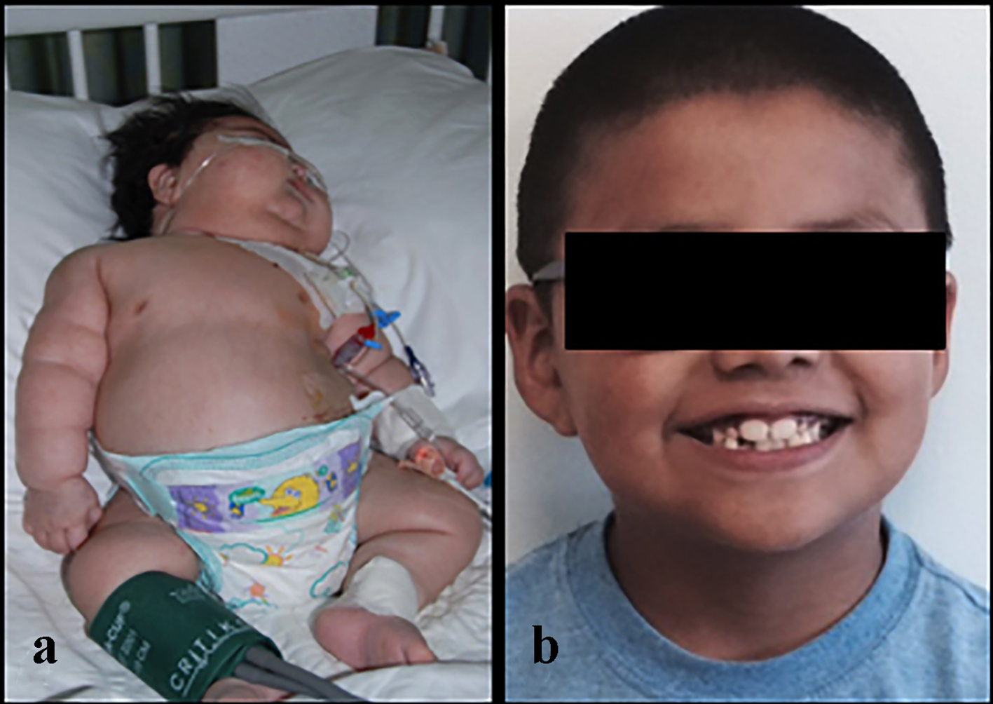 ![]() Click for large image | Figure 1. A 4-month-old male infant with an adrenocortical carcinoma at the time of presentation (a) and the same boy (b) at 7 years of age. |