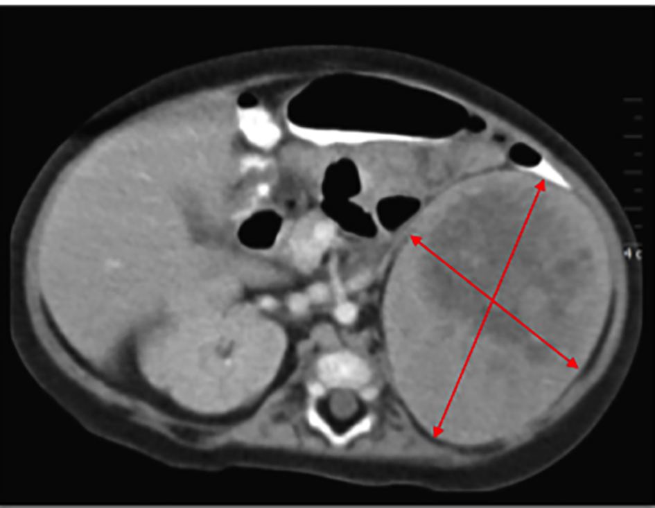 ![]() Click for large image | Figure 2. CT scan reports 6.8 × 7.7 cm size mass at the upper pole of left kidney. |