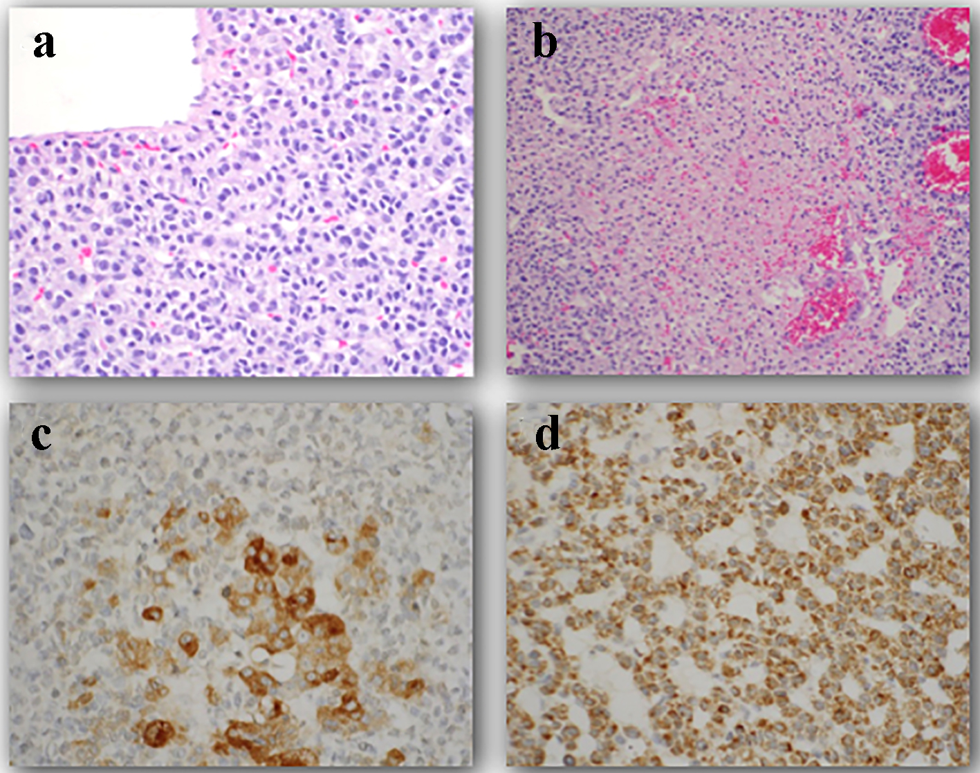 ![]() Click for large image | Figure 3. Histology of a high grade adrenocortical carcinoma in a 4-month-old male. (a) The tumor cells have large nuclei and prominent nucleoli. Furthermore, prominent mitotic figures are seen. (b) Confluent areas of necrosis are visualized. (c) Tumor cells show positive reaction for synaptophysin. (d) Tumor cells have positive reaction for melan-A. |