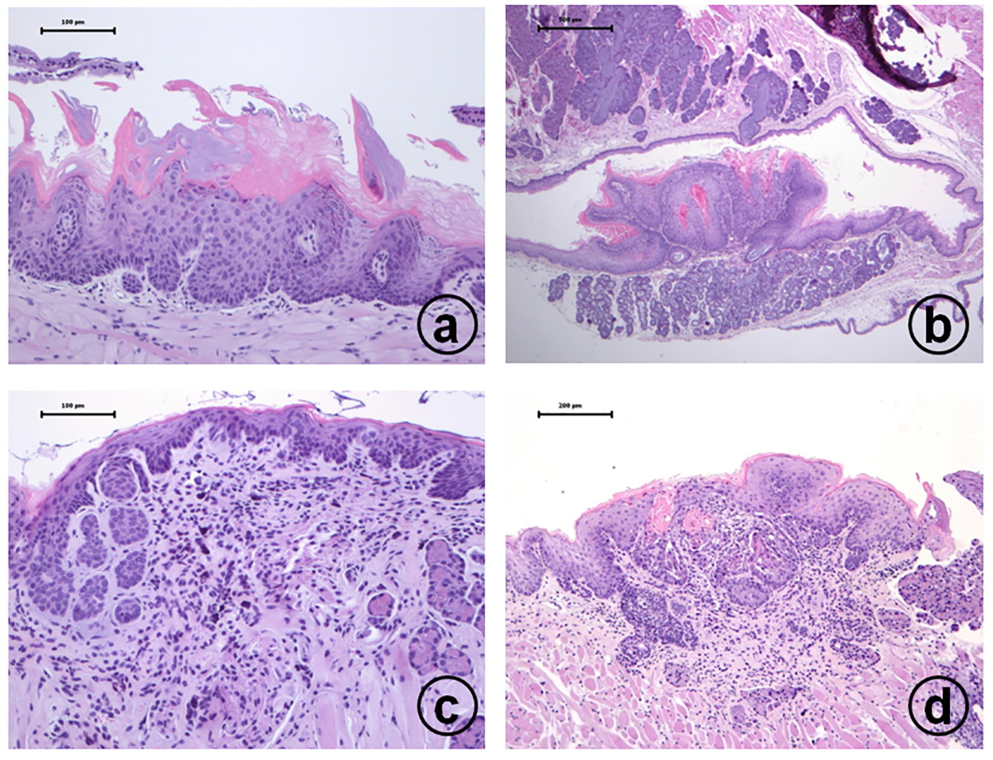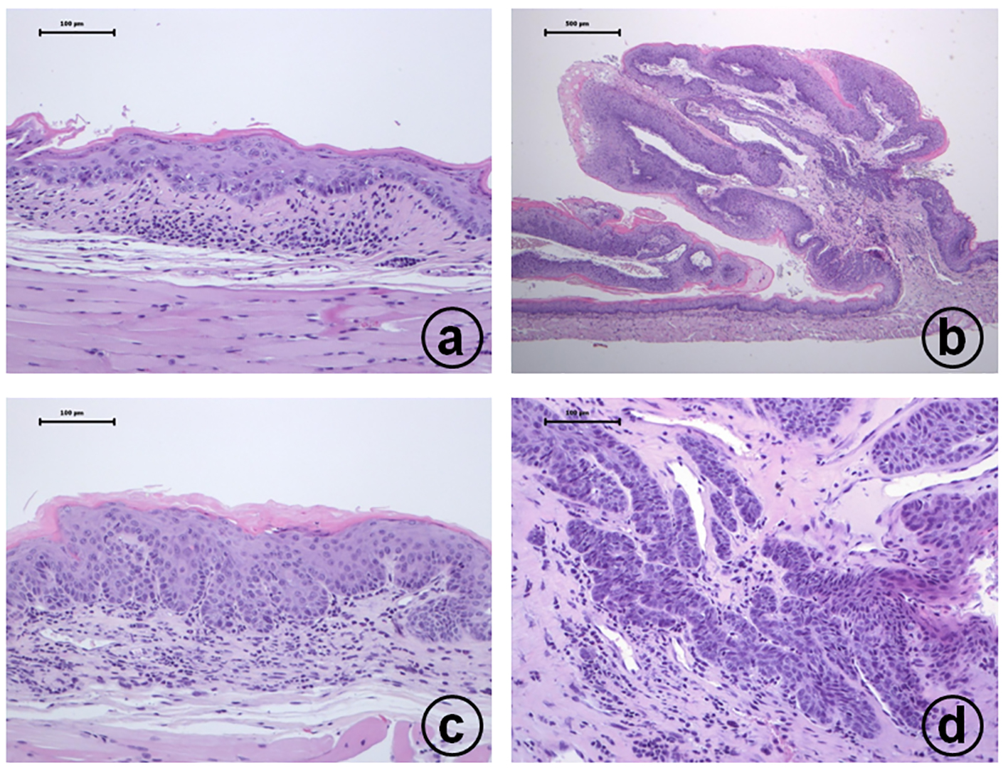 ![]() Click for large image | Figure 1. Histopathology of tongue proliferative lesions developed in male TSOD mice treated with 20 ppm 4-NQO in drinking water: (a) moderate dysplasia; (b) squamous cell papilloma; (c) carcinoma in situ; (d) invasive squamous cell carcinoma. Hematoxylin and eosin stain, bar = 100 µm. |