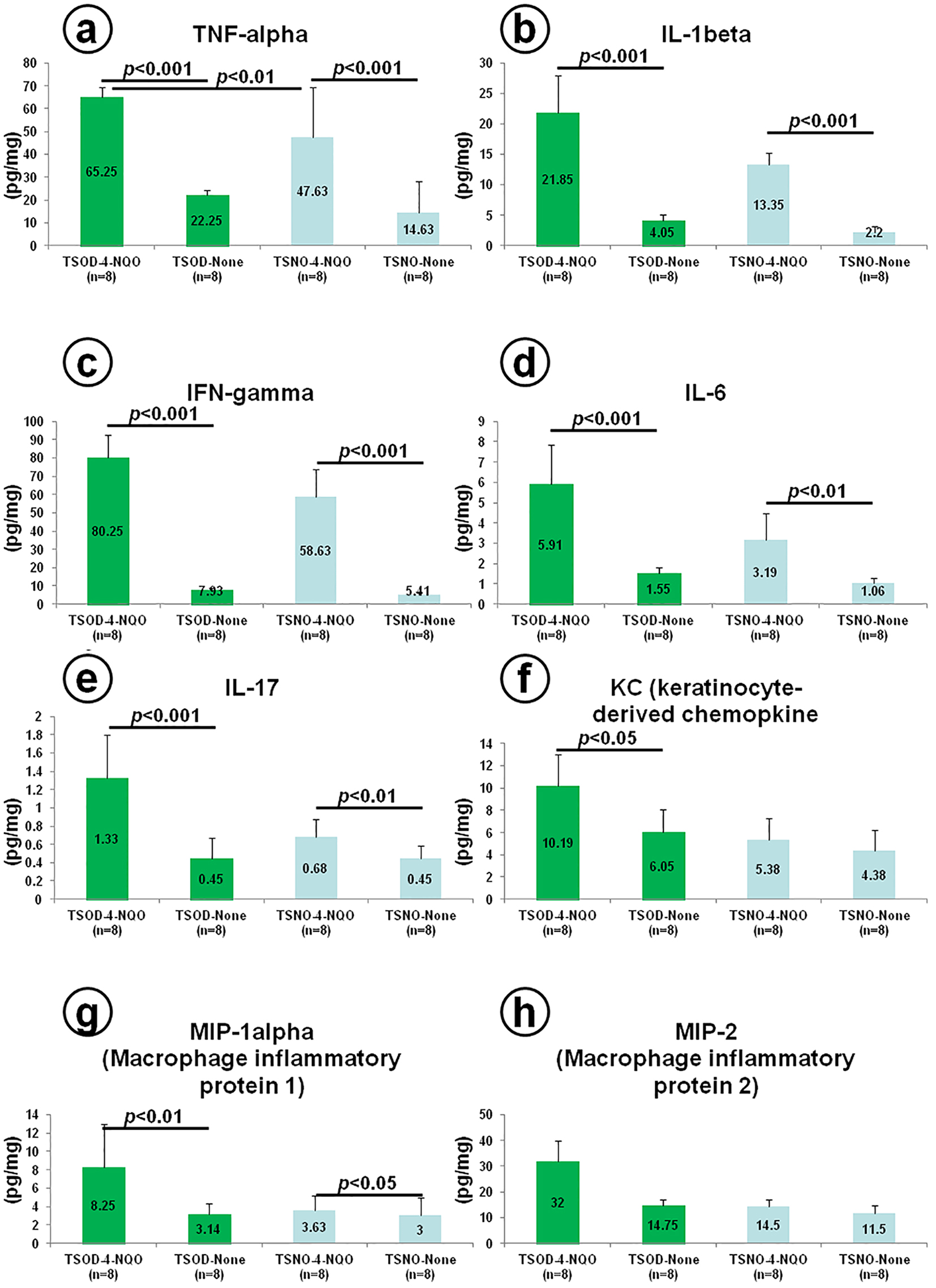![]() Click for large image | Figure 3. Measures of esophageal cytokines and chemokines in a short-term experiment using 16 male TSOD and 16 male TSNO mice given tap water with or without 20 ppm 4-NQO for 8 weeks. At 8 weeks after the start of the experiment: (a) TNF-α, (b) IL-1β, (c) IFN-γ, (d) IL-6, (e) IL-17, (f) CXCL1/KC, (g) CCL3/MIP-1α, and (h) CXCL2/MIP-2. |