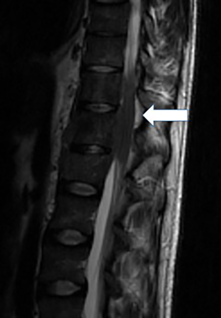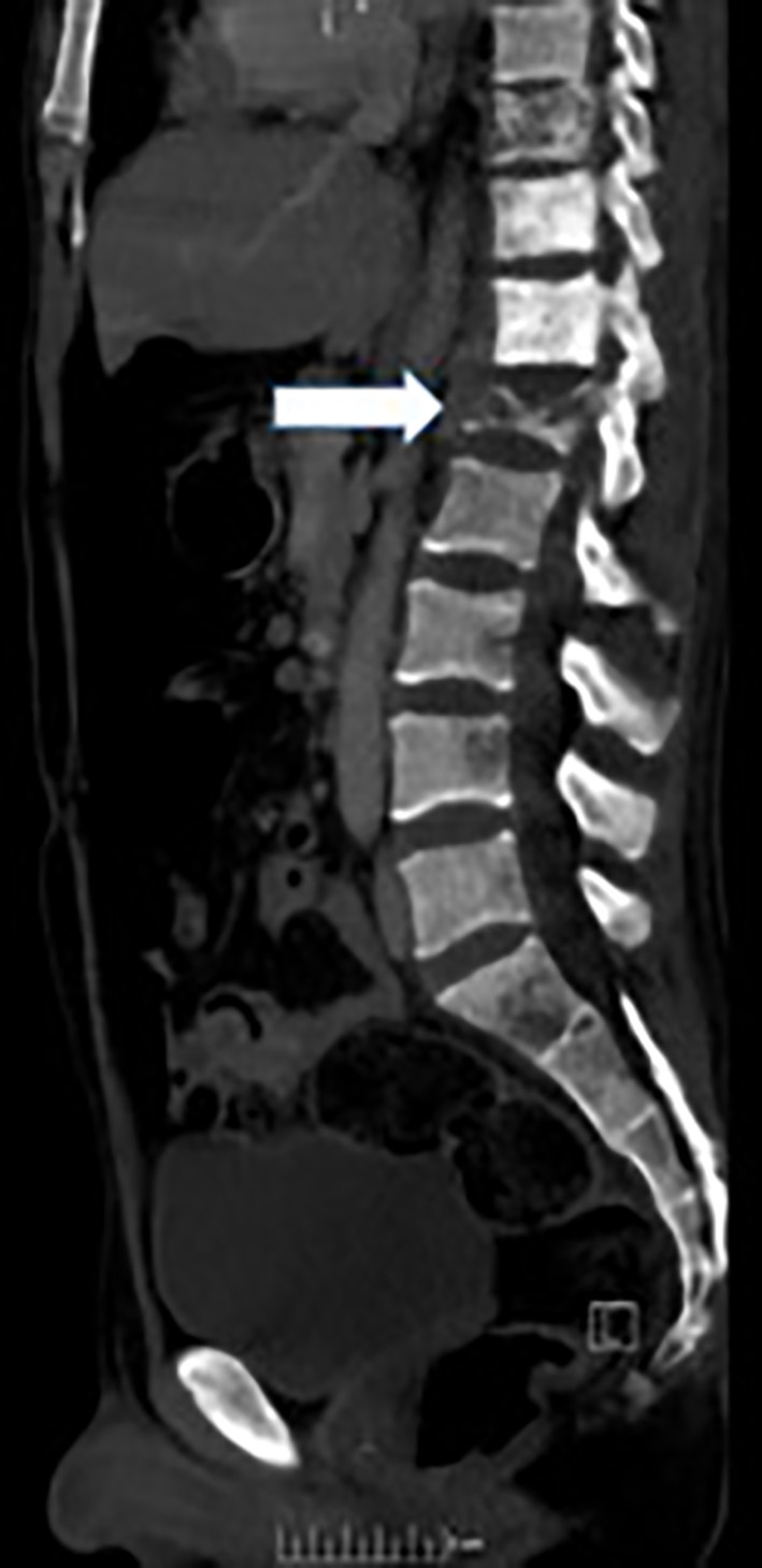 Figure 1. MRI spine depicting the lytic destruction of the spinal bodies and epidural mass at level T12-L1.