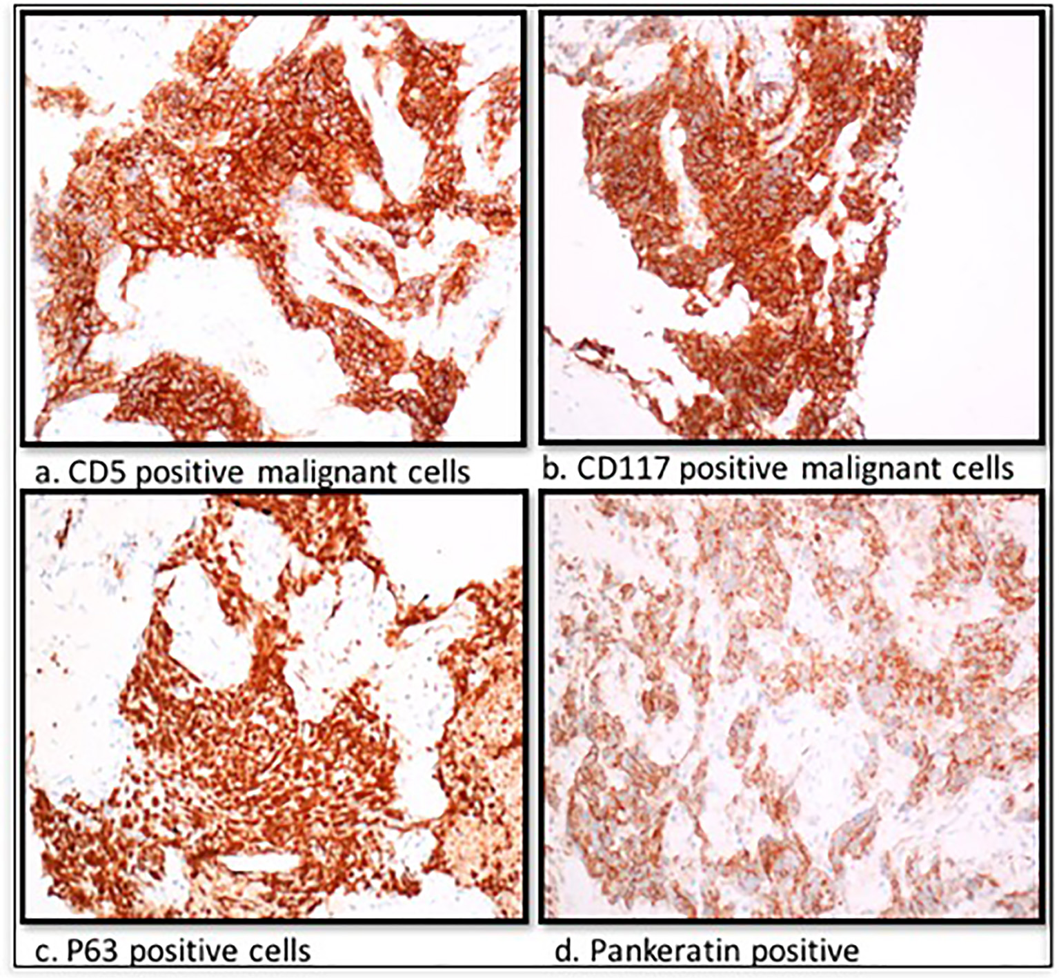 Histopathological analysis of the biopsy revealed positive immunohistochemical markers AE1 and AE3, CD5, CD117, P63 and pankeratin (Fig. 5) and negative CD45, CD 117 and CD20 consistent with diagnosis of primary thymic carcinoma. On day 5 of admission, there was a worsening of muscle power in the lower extremities with 4/5 in right and 3/5 in left lower extremity, respectively. Neurosurgical intervention with a T11-L1 laminectomy and resection of epidural tumor was performed. Surgical pathology of the T12 epidural mass was similar to the left supraclavicular node biopsy formulating a final diagnosis of metastatic thymic carcinoma with a rare initial presentation with spinal cord compression.