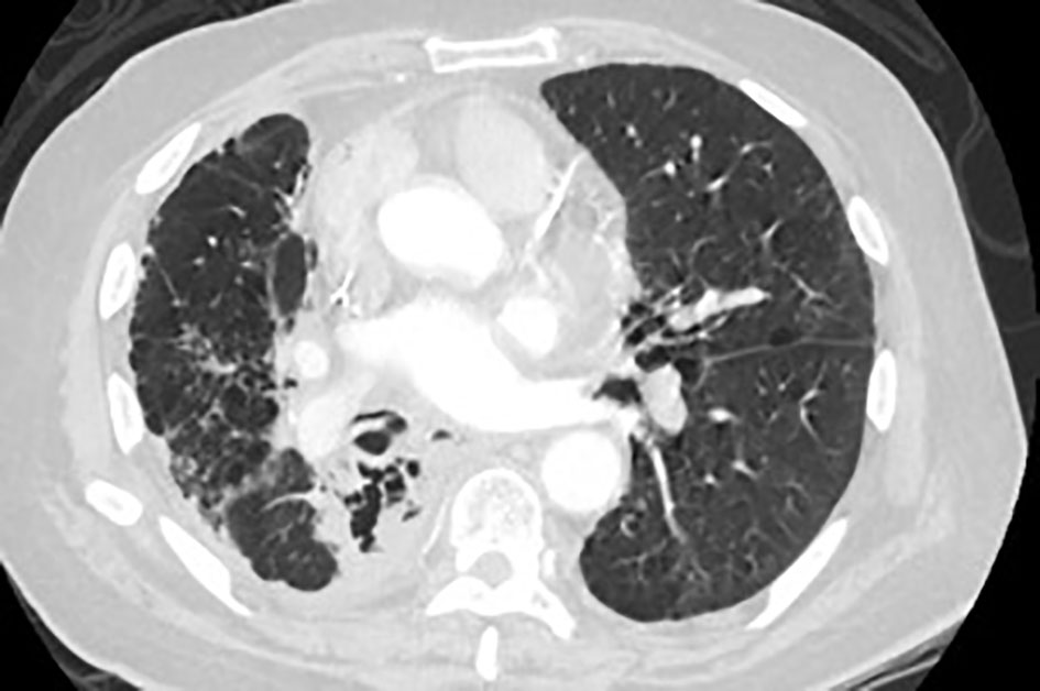 ![]() Click for large image | Figure 1. CT scan of the lung shows left apical necrotizing mass. |