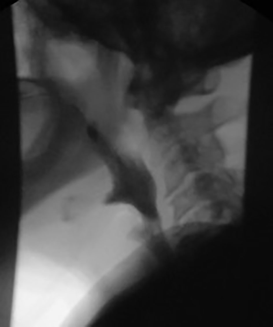 ![]() Click for large image | Figure 2. Video swallow evaluation shows a linear exclusion of contrast from mid esophagus into the tracheobronchial tree consistent with tracheobronchial fistula. |