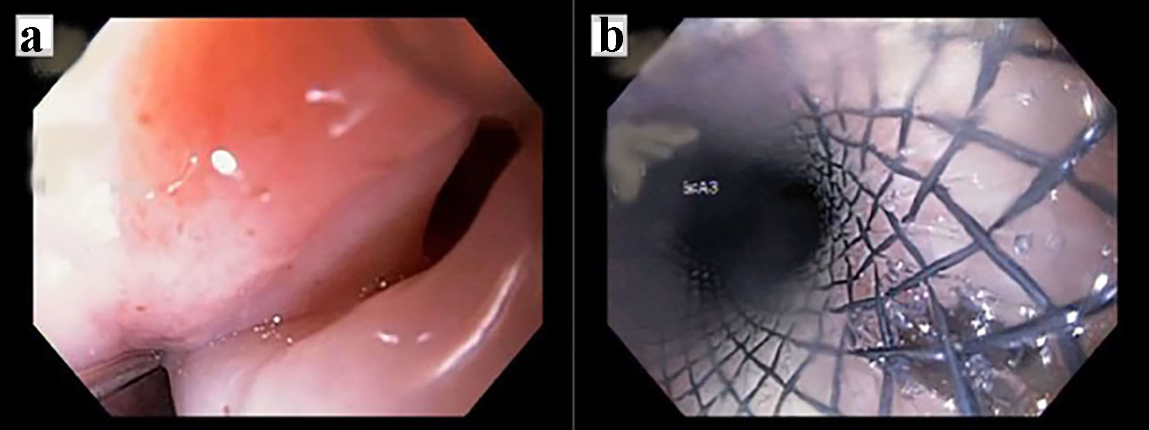 ![]() Click for large image | Figure 3. (A) Fistula in the middle third of the esophagus at about 25 cm. (B) Prosthesis placed from approximately 20 - 30 cm. Partially covered esophageal stent. |
