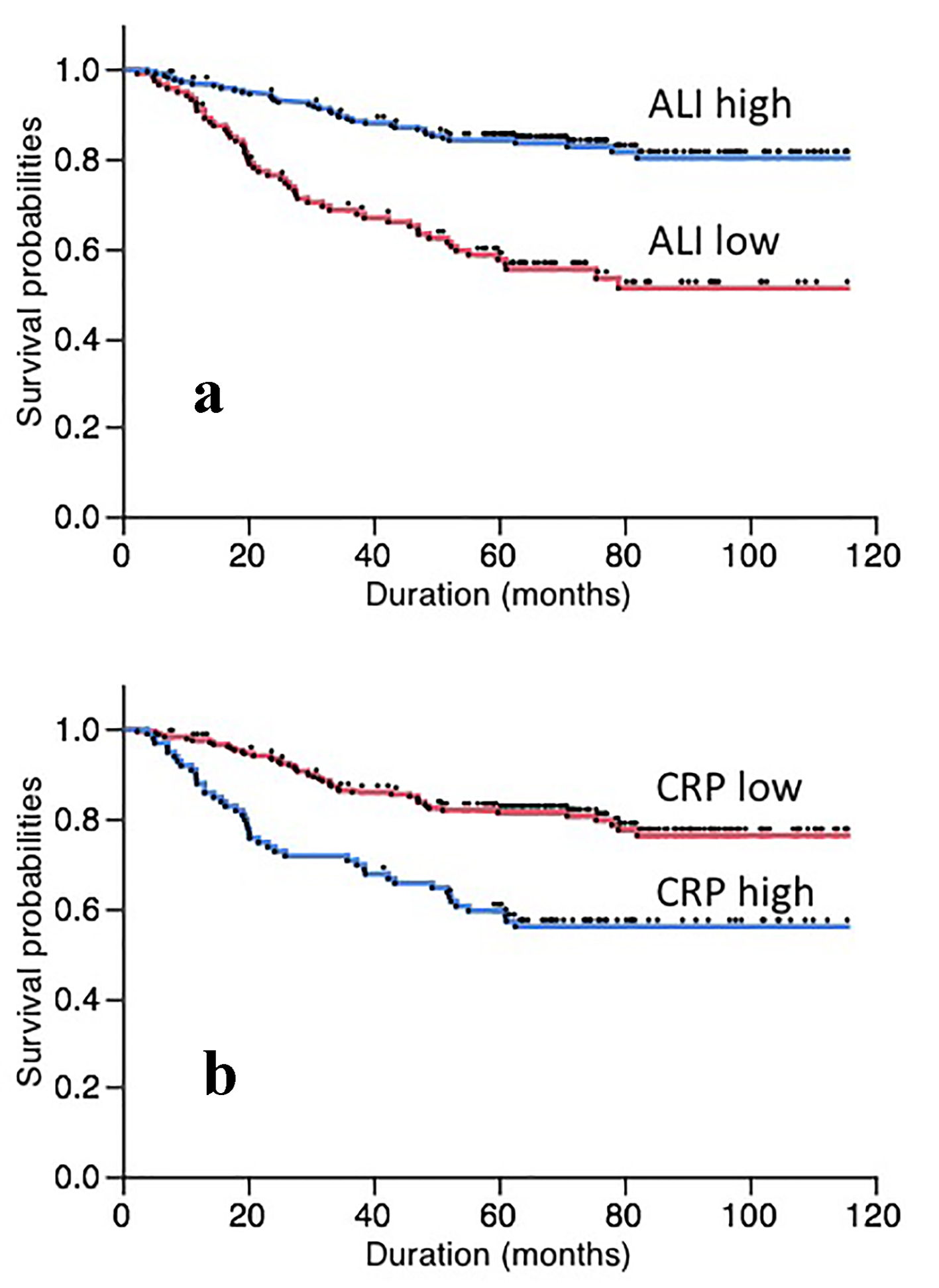 Comparison of overall postoperative cancer-specific survival curves between the low and high ALI groups was shown in Figure 1a. Overall postoperative cancer-specific survival was significantly higher in the high ALI group than in the low ALI group (P < 0.001). Similarly, comparison of postoperative cancer-specific survival curves according to CRP showed that there was a significant difference for patients’ survival (Fig. 1b). The patients with high CRP (> 0.15 mg/dL) had a significantly worse survival than those with low CRP (P < 0.001).