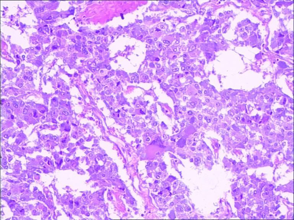 ![]() Click for large image | Figure 2. Eccentric nuclei large cell is shown by basophil included. Immunohistochemistry shows CgA (+), Syn (+). |