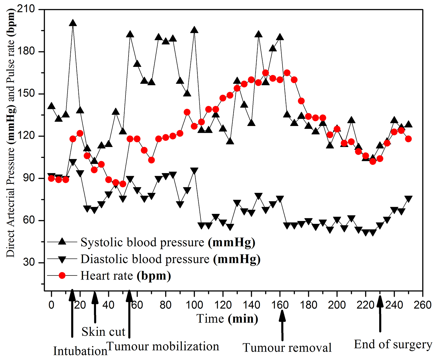 In the operating room, patient was well prepared with ECG heart rate at 75 times/min, oxygen saturation at 99%, and non-invasive right upper limb blood pressure at 145/85 mm Hg. Patient was given continuously suprofen at 5 µg and romethorphan 0.5 µg/kg/min for 10 min, and then changed to maintenance dose of 0.2 µg/kg/h. After the patient fell asleep, radial artery cannulation and subclavian vein cannulation were established to allow monitoring invasively blood pressure and central venous pressure (CVP). Muscle relaxation and anesthesia depth were also continuously monitored. At this stage, 4 mg of midazolam, 30 µg of sufentanil, 150 mg of propofol, and 50 mg of rocuronium bromide were induced. After the muscle relaxation and anesthesia depth met the requirements of intubation, tracheal intubation was carried out followed by assisted ventilation. The invasive radial artery pressure rose sharply to 200/102 mm Hg and the heart rate rose to 118 beats/min during intubation (Fig. 3); bolus injected 2 mg of phentolamine and 30 mg of esmolol were given in response. During the surgical procedure, 4 mg/kg/h of propofol, 0.15 µg/kg/min of remifentanil, and sevoflurane 1 - 2 MAC were continuously given to maintain BIS value within the range of 40 - 50; rocuronium was also intermittently injected to make TOF < 1. During the surgical exploration, the blood pressure rose sharply to 192/120 mm Hg, and heart rate increased to 118 times/min upon touch the tumor (Fig. 3). Exploration was temporarily halted in order to adjust the blood pressure to 160/85 mm Hg, heart rate of 110 times/min or less with the following procedure: bolus injection of 2 mg of phentolamine and 30 mg of esmolol, then continuously infusion, via pump, of phentolamine at the rate of 0.5 mg/min via pump, sodium nitroprusside at the rate of 1 µg/kg/min, and esmolol at the rate of 100 µg/kg/min. Surgical procedure went ahead when this was reached during which blood pressure was maintained at 150 - 195/90 - 102 mm Hg (Fig. 3). During operation, the reflux vein on the tumor surface was sutured. It was found that the inferior mesentery artery and the inferior mesentery vein were intimately conjoined the edge of the tumor and could not be dissected away from the tumor body. Two branches of arteries derived from aorta fed the tumor. These vessels, namely inferior mesentery artery and vein and the feeding aortic branches, were all ligated and cut away from the tumor body, to allow completely removal of the tumor.