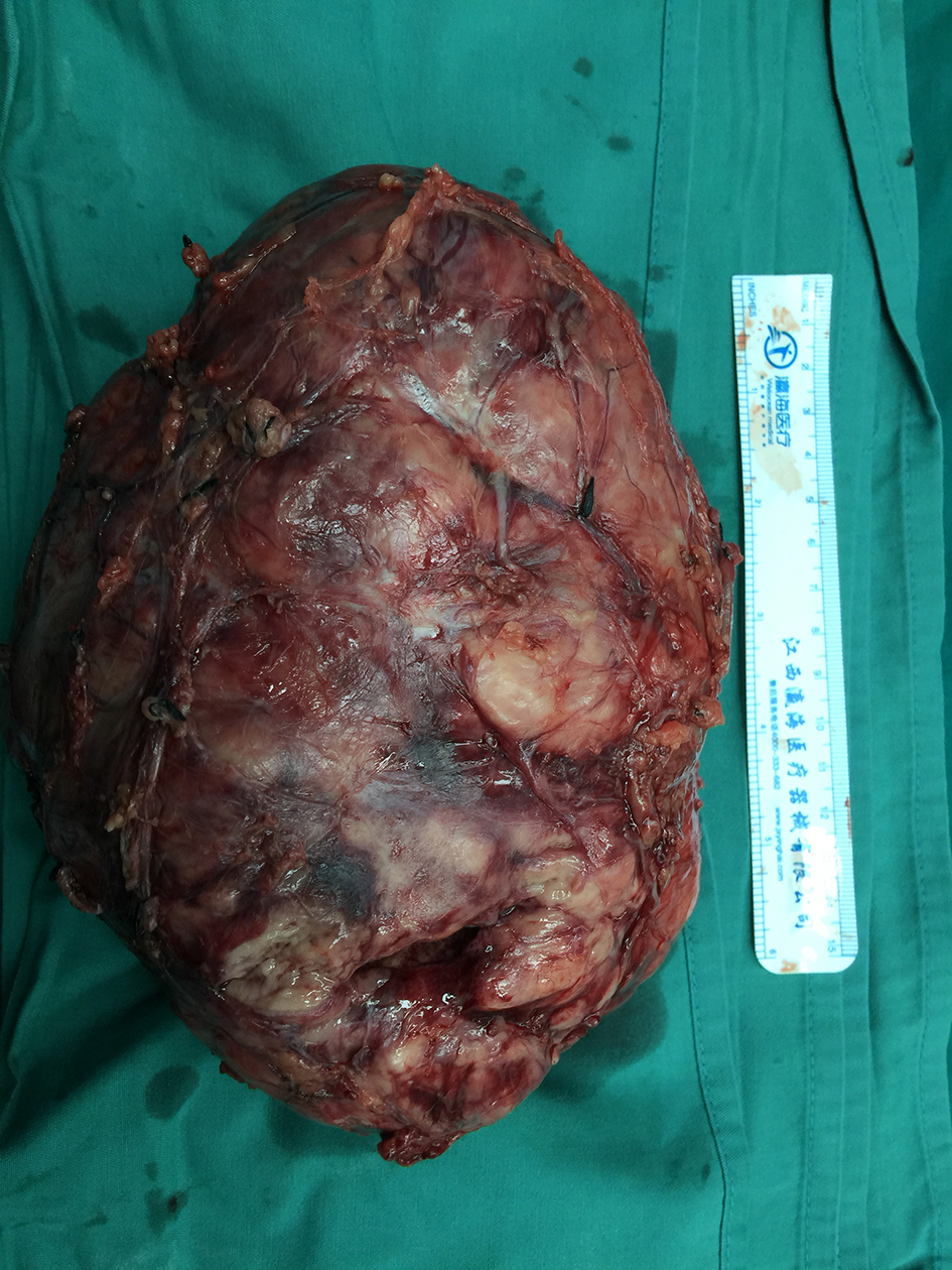 Pathological examination revealed that the tumor was large in size, 20 × 14 × 5 cm (Fig. 4). The capsule was intact, part of which was affected by the tumor. A proportion of tumor cells showed signs of fast growing with nuclear mitosis at 3/50 HPF. The pathological diagnosis was pheochromocytoma; immunohistochemistry showed CgA (+), Syn (+), S-100 (+), Ki-67 (+ about 1%). The patient was cured and discharged on the 10th day after surgery with no complications.