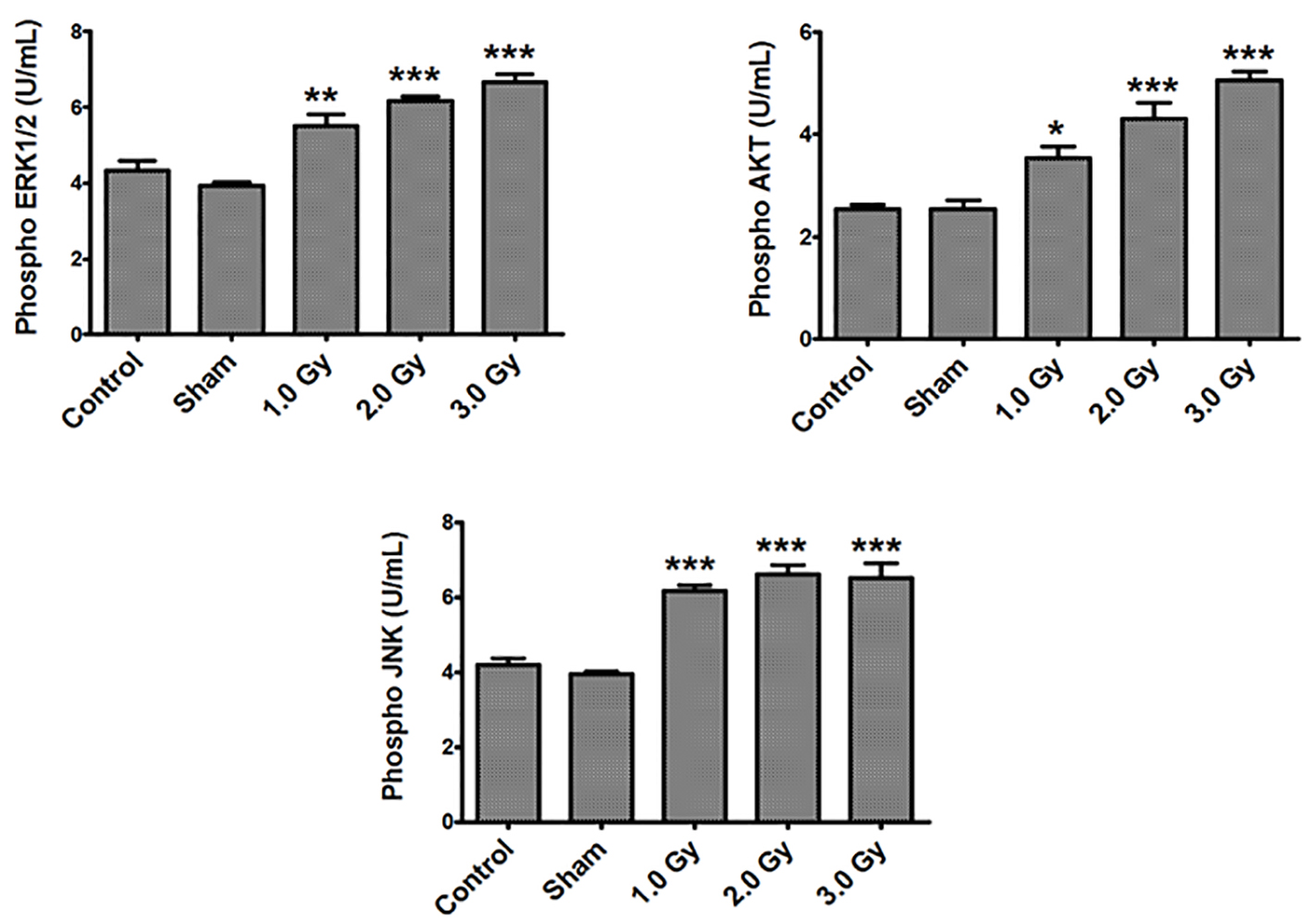 ![]() Click for large image | Figure 1. Exposure of B16F10 cells to radiation increased phosphorylated ERK1/2, AKT and JNK levels. There were no significant differences in any of the measured phosphorylated proteins between control and sham-treated groups. Phosphorylated ERK1/2 levels - control or sham versus 1.0 (P < 0.001); control or sham versus 2.0 and 3.0 Gy (P < 0.0001). Phosphorylated AKT levels - control versus 1.0 Gy (P < 0.01); sham versus 1.0 Gy (P < 0.001); control or sham versus 2.0 and 3.0 Gy (P < 0.0001). Phosphorylated JNK levels - control or sham versus 1.0, 2.0 and 3.0 Gy (P < 0.0001). |