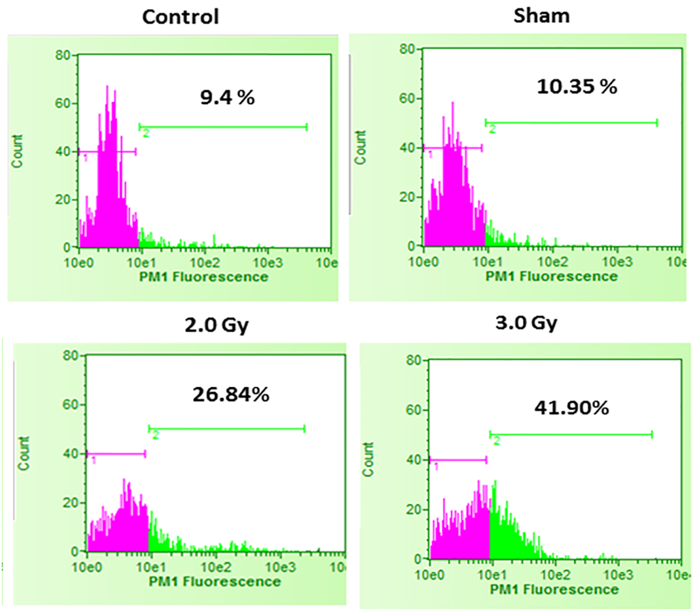![]() Click for large image | Figure 2. Cell death in control B16F10 cells, sham-irradiated cells, 2.0 Gy irradiated cells and 3.0 Gy irradiated cells. Compared to control and sham-irradiated cells, 2.0 Gy and 3.0 Gy of irradiation significantly increased cell death (P < 0.0001). Further, compared to 2.0 Gy irradiation, irradiation with 3.0 Gy significantly increased cell death (P < 0.001). Pink color indicates viable cell fraction and green color indicates dead cell fraction. |
