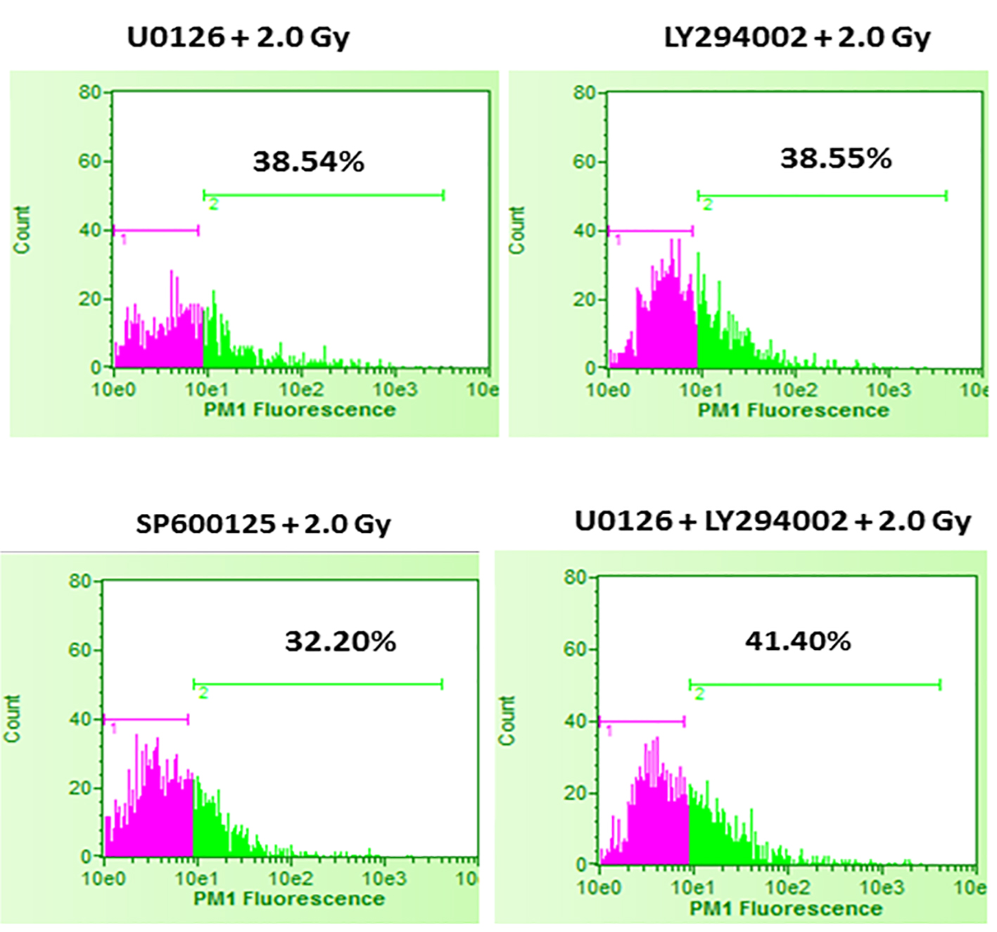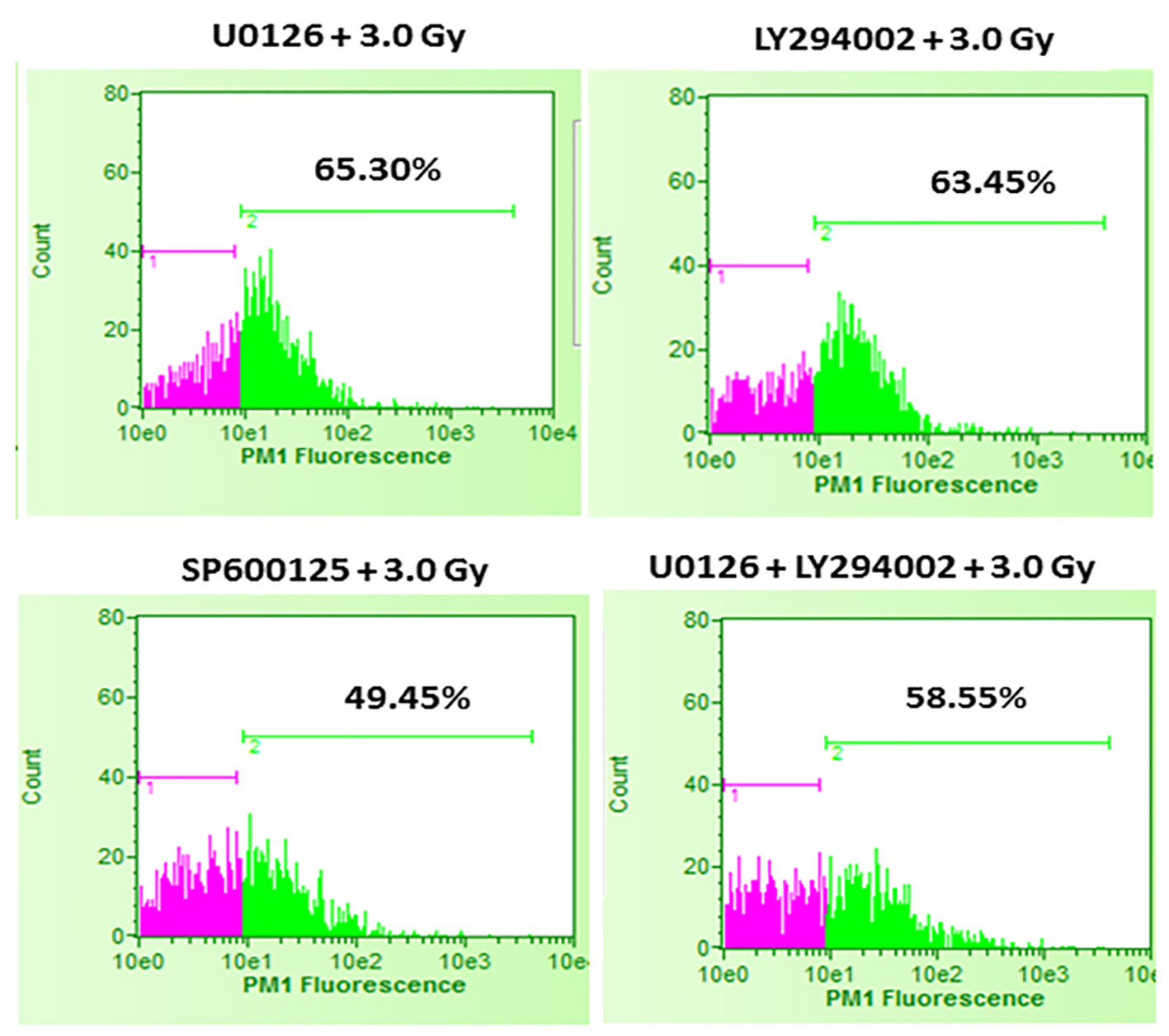Cells (1 × 105) were seeded in 12.5 cm2 culture flasks and allowed for cell attachment and recovery. After 24 h of incubation, media was aspirated and replaced with media containing 20 µM concentrations of U0126, LY294002 or without drugs. After 24 h, cells were irradiated as explained earlier. After 4 h of irradiation, cultures were washed with cold PBS, and cells were harvested by scraping with a rubber policeman. Collected cells were centrifuged at 4 °C for 5 min and the cell pellets were treated with ice-cold cell extraction buffer containing protease and phosphatase inhibitor for 30 min, on ice, with vortexing at 10 min intervals. Cell extractions were micro-centrifuged at 13,000 rpm for 10 min at 4 °C. The supernatants were collected and stored at -80 °C until analysis. Phosphorylated ERK1/2 (p-ERK1/2; Cat No. KHO0091), phosphorylated AKT (p-AKT; Cat No. KHO0541), and phosphorylated JNK (p-JNK; Cat No.KHO0131) - all from Invitrogen - were measured according to manufacturer’s protocols.