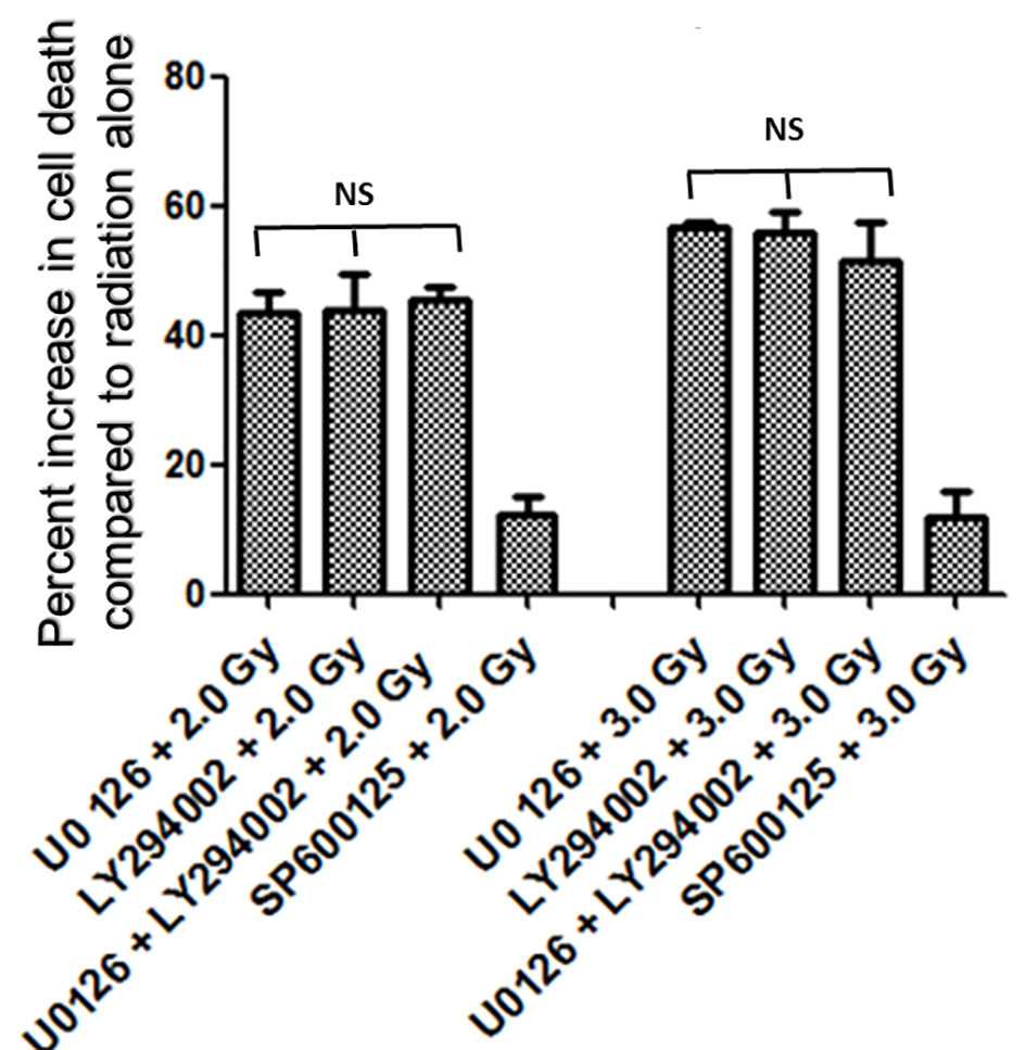 ![]() Click for large image | Figure 4. Increase in amount of cell death (%) with inhibitors of ERK1/2, AKT and JNK pathways. Inhibition of either ERK1/2 or AKT pathways enhanced radiation-induced cell death almost equally (about 43% at 2.0 Gy and about 55% at 3.0 Gy), while inhibition of JNK enhanced relatively low amount of cell death (about 12%) at 2.0 Gy as well as at 3.0 Gy. Combined inhibition of U0126 + LY294002 prior to radiation treatment enhanced radiation induced cell death at 2.0 Gy by 45% and at 3.0 Gy by 51%. Overall no significant difference in percent increase in cell death was observed between U0126, LY294002 or their combination both with 2.0 Gy and 3.0 Gy treatments. |