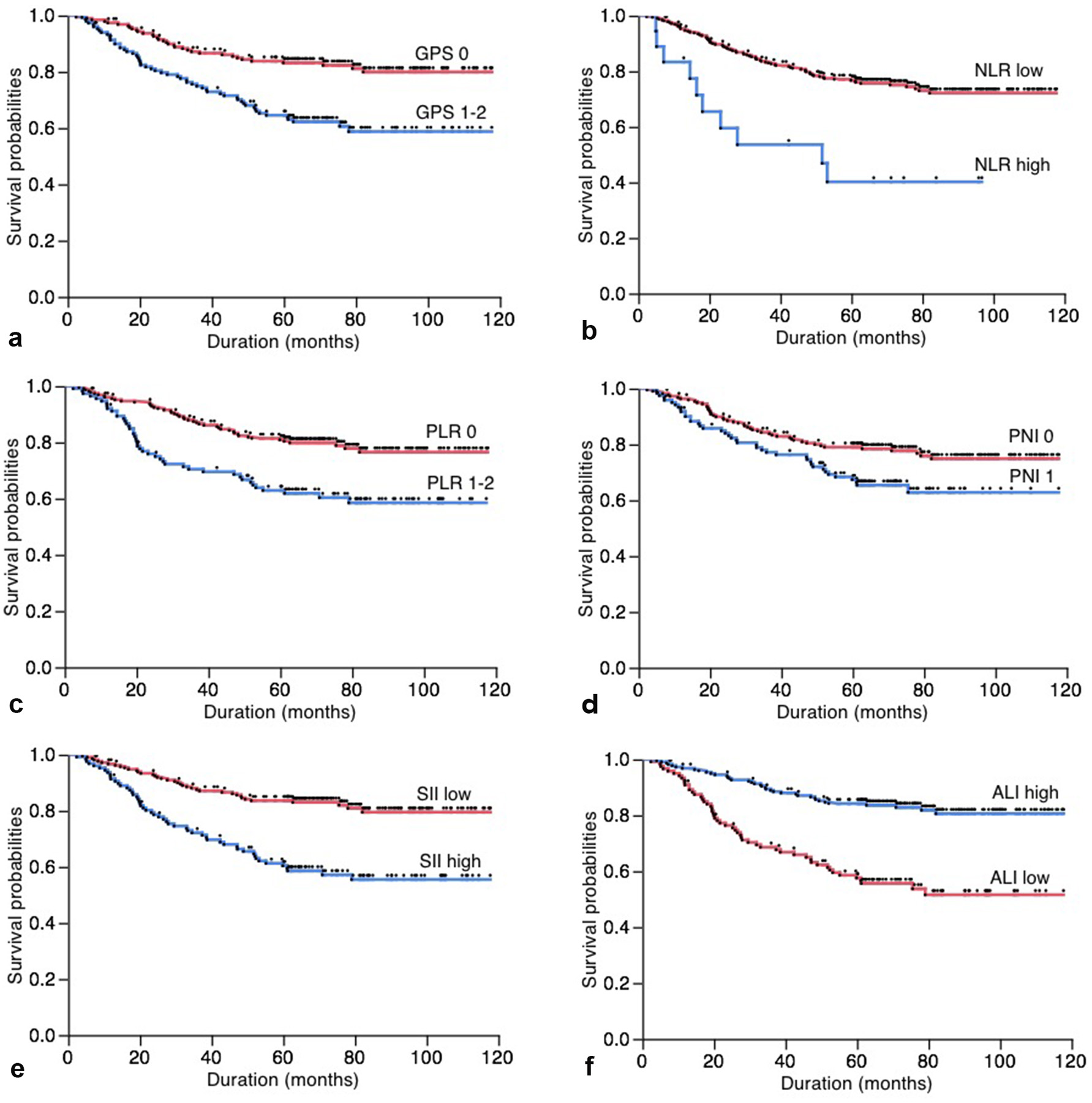 The relationship between the inflammation-based prognostic scores and cancer-specific overall survival is shown in Figure 1. Based on total number of patients, the 5-year cancer-specific overall survival of patients with GPS 0, low NLR, PLR 0, PNI 1, low SII and high ALI were 83.19%, 76.75%, 80.92%, 79.01%, 83.61% and 84.20%, respectively. On the other hand, those of patients with GPS 1-2, high NLR, PLR 1-2, PNI 0, high SII and low ALI were 64.53%, 40.18%, 62.89%, 67.40%, 860.39% and 57.61%, respectively. All of GPS (P < 0.001), NLR (P < 0.001), PLR (P < 0.001), PNI (P = 0.014), SII (P < 0.001) and ALI (P < 0.001) were associated with a cancer-specific overall survival.