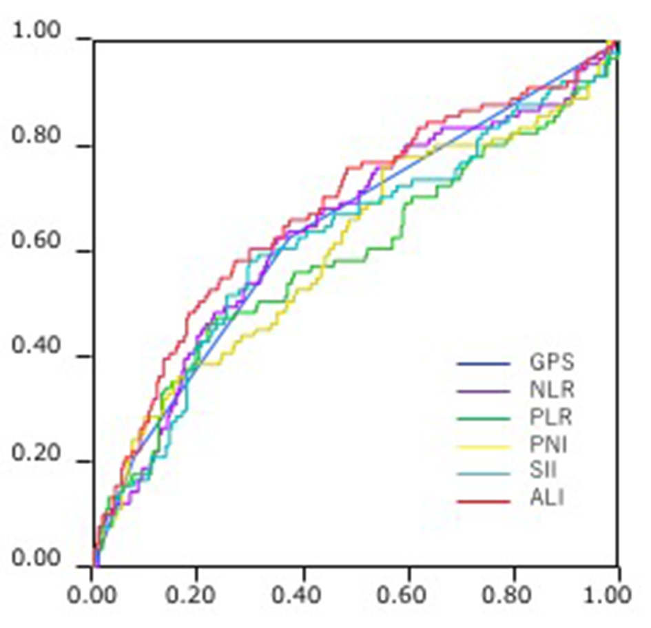 Comparison of the AUCs for cancer-specific overall survival prediction between these inflammation-based prognostic scores was shown in Figure 2. The AUCs of GPS, NLR, PLR, PNI, SII and ALI were 0.642, 0.643, 0.590, 0.608, 0.623 and 0.681, respectively. ALI consistently had a higher AUC value in comparison with other inflammation-based scores.