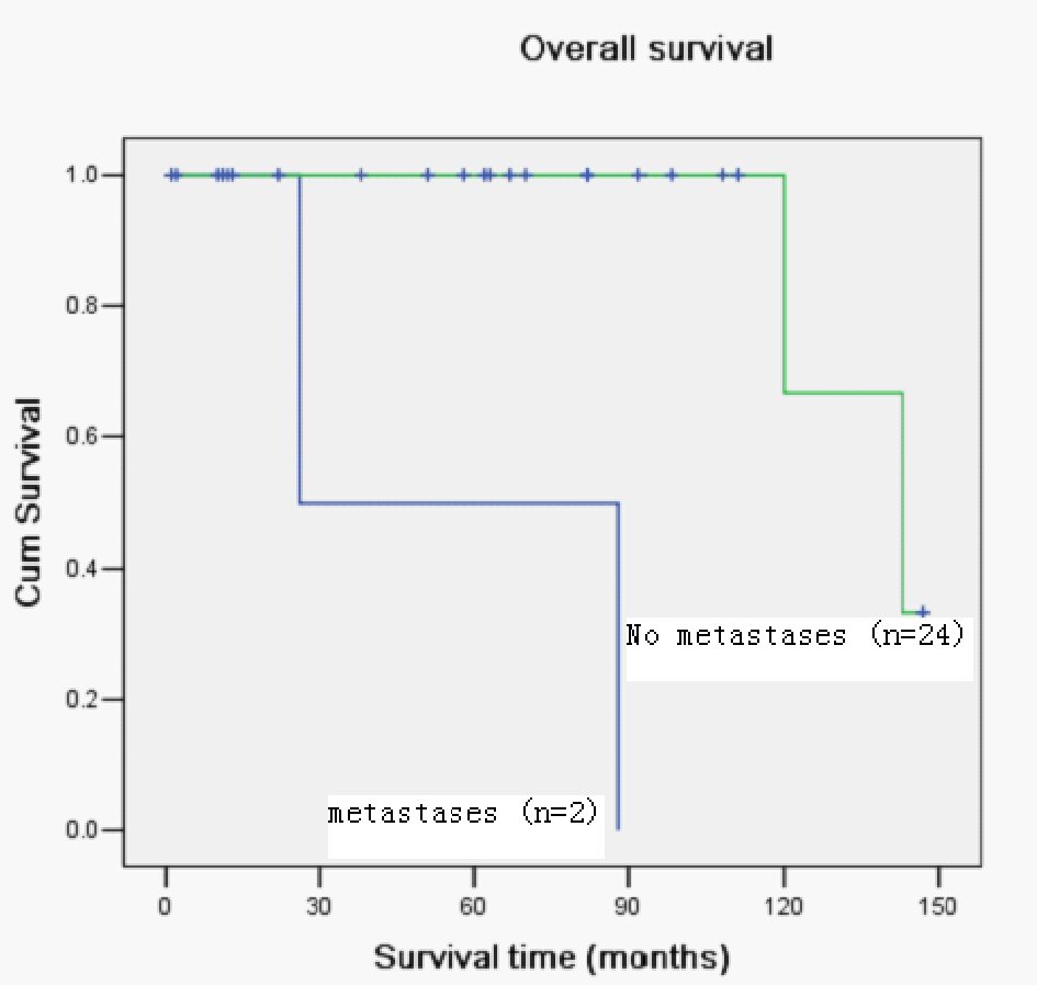 Of the 26 patients, four patients died. The overall 5-year survival rates of all patients were 89.2%.Univariate analysis revealed that the key prognostic factors influencing the survival of these patients were the lymph nodes metastasis and surgery margin (Figs. 1, 2; Table 1). There was no significant correlation between TC and gender, tumor size, age and local recurrence.