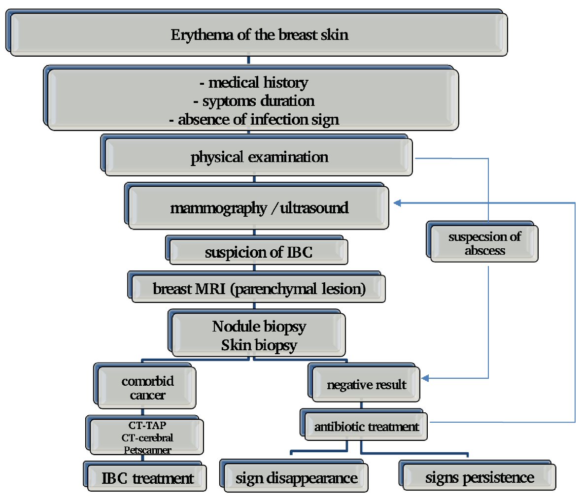 At present, there are no definitive molecular or pathological diagnosis criteria for IBC. Therefore, the diagnosis is entirely based on clinical symptoms such as the rapid onset of signs like erythema and edema of the breast skin (orange peel), i.e. the possibility of misleading between IBC and benign bacterial infections such as mastitis is high, that is why it is important to note that IBC is not usually associated with symptoms of infection such as fever [11].