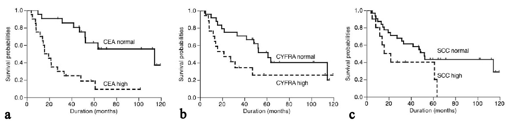 The 5-year cancer-specific survival based on serum CEA, CYFRA21-1 and SCC levels were shown in Figure 2. Patients with high serum CEA level had 9.4% of survival, while patients with normal CEA level had 55.6% of survival (P < 0.001, Fig. 2a). On the other hand, the cancer-specific 5-year survival of patients with high and normal serum CYFRA21-1 levels was 25.7% and 51.6%, respectively. Similarly, patients with high and normal serum SCC levels had a 5-year survival of 40.0% and 43.2%, respectively. There was a trend towards an association between serum CYFRA21-1 or SCC level and cancer-specific survival but this did not reach statistical significance (P = 0.068 and 0.061, respectively, Fig. 2b, c).