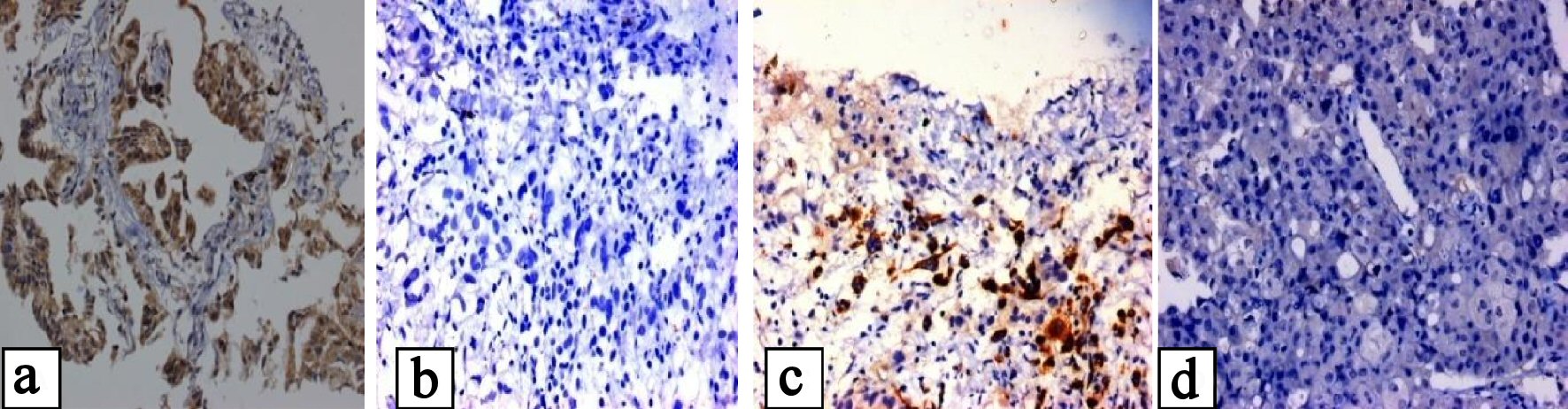 The IHC staining score was based on the staining intensity and percentage positivity (0-100%) of cells in the membrane and/or cytoplasm of tumor cells. Four grades were employed: 0, 1+, 2+, and 3+. 0 means no staining; 1+ means faint membrane and/or cytoplasmic staining in less than 10% positive cells; 2+ means moderate membrane and/or cytoplasmic staining in greater than 10% and less than 50% cells; 3+ means strong membrane and/or cytoplasmic staining more than 50% cells positive. 0 and 1+ scores were considered as negative; whereas 2+ and 3+ were considered as positive cases.