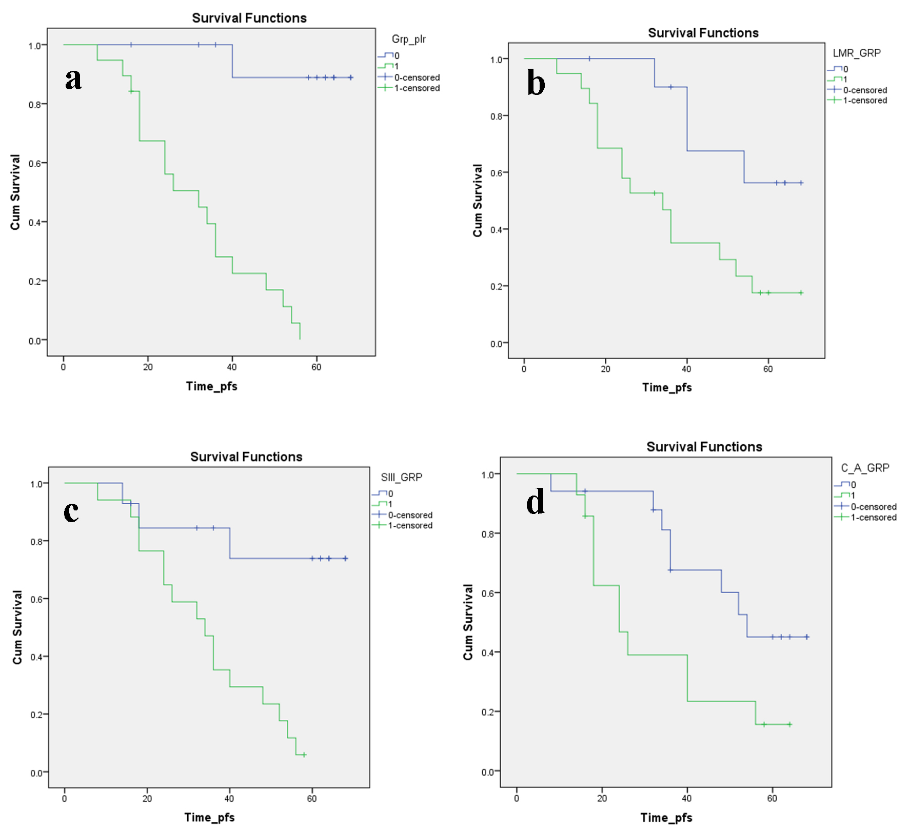 ![]() Click for large image | Figure 2. Kaplan-Meier plots illustrating PFS according to the (a) PLR, (b) LMR, (c) SII index and (d) CAR, respectively. PFS: progression-free survival; PLR: platelet to lymphocyte ratio; LMR: lymphocyte to monocyte ratio; SII: systemic immune inflammation; CAR: C-reactive protein/albumin ratio. |
