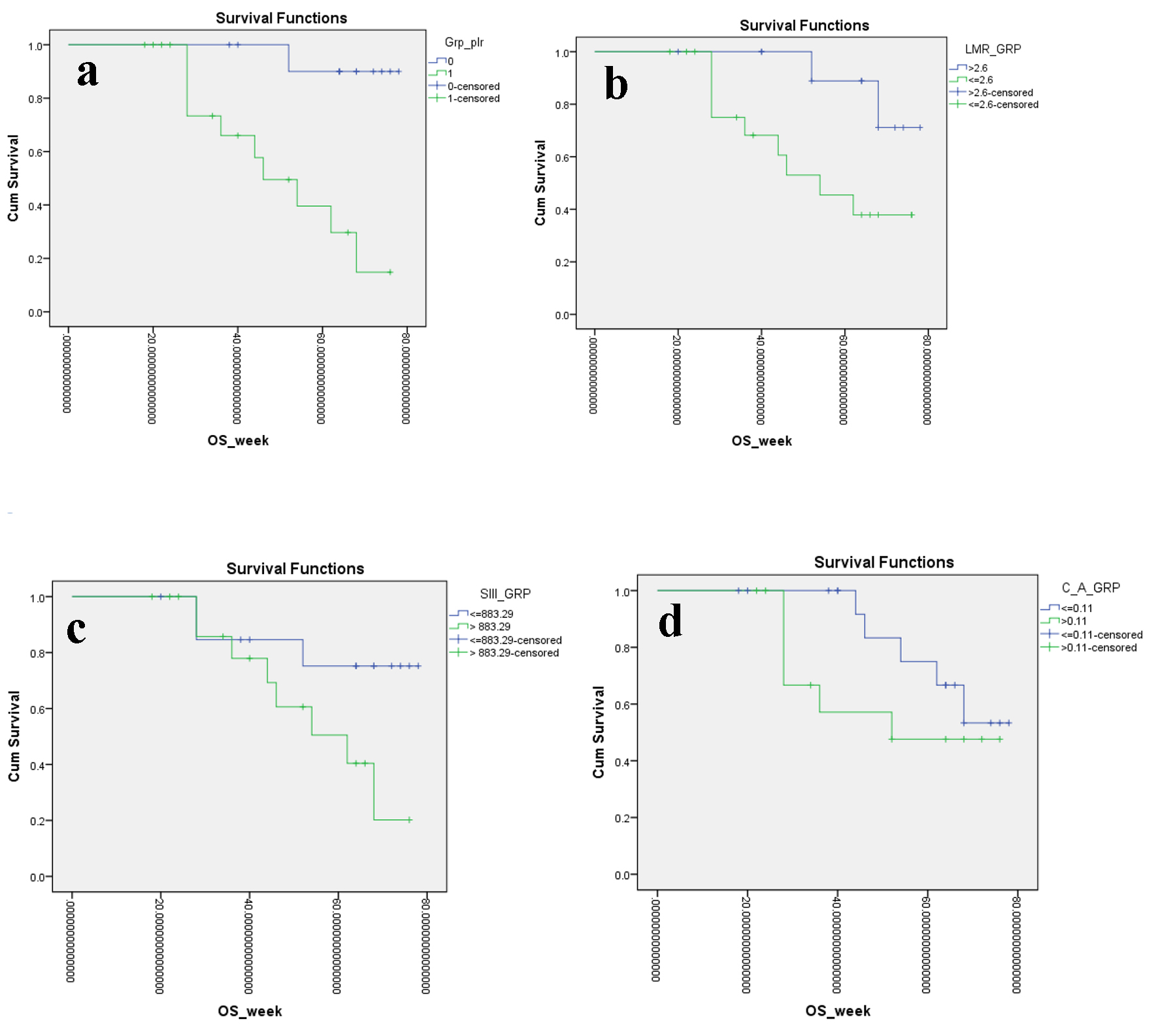 ![]() Click for large image | Figure 3. Kaplan-Meier plots illustrating OS according to the (a) PLR, (b) LMR, (c) SII index and (d) CAR, respectively. OS: overall survival; PLR: platelet to lymphocyte ratio; LMR: lymphocyte to monocyte ratio; SII: systemic immune inflammation; CAR: C-reactive protein/albumin ratio. |