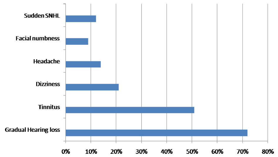 A cohort of 30 patients, summarized in the study, had been followed retrospectively between January 2014 and January 2017 for a median follow-up of 12 months. Three (9%) were lost to follow-up and were excluded. The duration of disease was found to be 5 - 10 years in 9/33 (27%) patients, 10 - 15 years in 21/33 (63%), and 15 - 20 years in 3/33 (9%). There was a slight female preponderance 1.2:1 (18:15). Age distribution was: 3 (9%) of 21 - 30 years; 5 (15%) of 31 - 40 years; 18 (54%) of 41 - 50 years; and 7 (21%) of 51 - 60 years. The mean age was 46 ± 3 years. Laterality of tumor was determined based on CT/MRI and was found more in the right side in 16/33 (48%), left side in 14/33 (43%) and the central in 3/33 (9%) patients. Clinical presentation included symptoms like gradual HL in 24/33 (72%) patients, tinnitus in 17/33 (51%), dizziness in 7/33 (21%), facial nerve paresthesia in 3/33 (9%) and sudden SNHL in 4/33 (12%) (Fig. 1).
