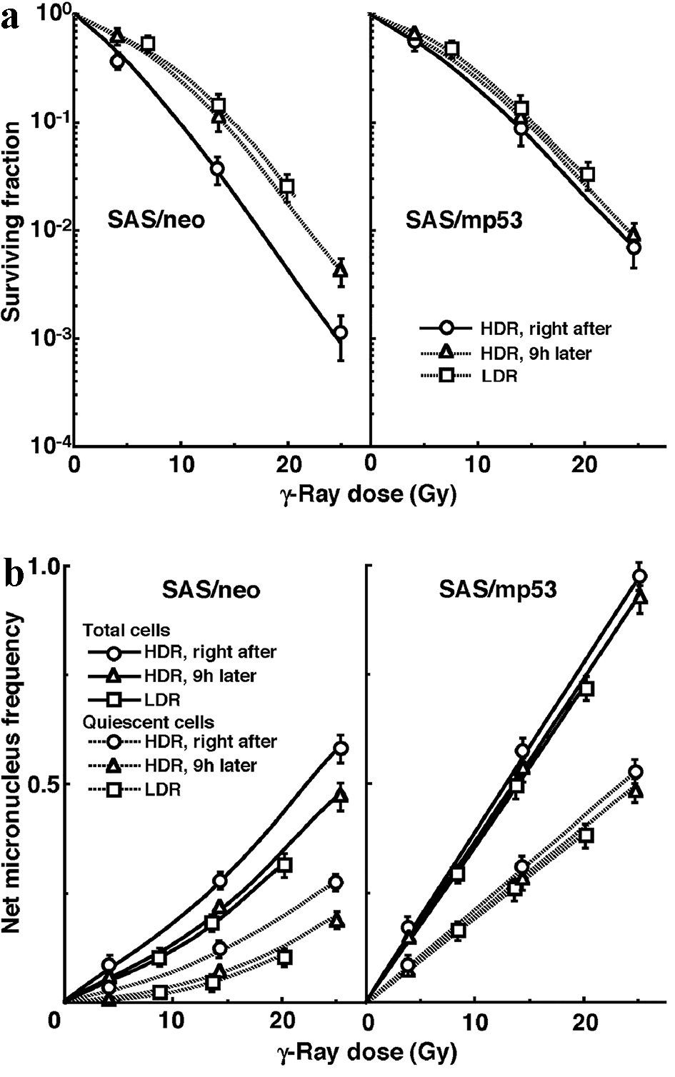 ![]() Click for large image | Figure 1. A marked reduction in sensitivity of SAS/neo tumor cells, especially quiescent tumor cells, compared with SAS/mp53 tumor cells with little recovery capacity. The clonogenic cell survival curves for total tumor cells and the net micronucleus frequencies for total and quiescent tumor cells immediately and 9 h after γ-ray irradiation with high dose-rate irradiation (HDR) and immediately after γ-ray irradiation with low dose-rate irradiation (LDR) are shown in (a) and (b), respectively. The left and right panels show SAS/neo and SAS/mp53 tumor cells, respectively. Bars represent 95% confidence limits. Three mice were used to assess each set of conditions and each experiment was repeated twice. |