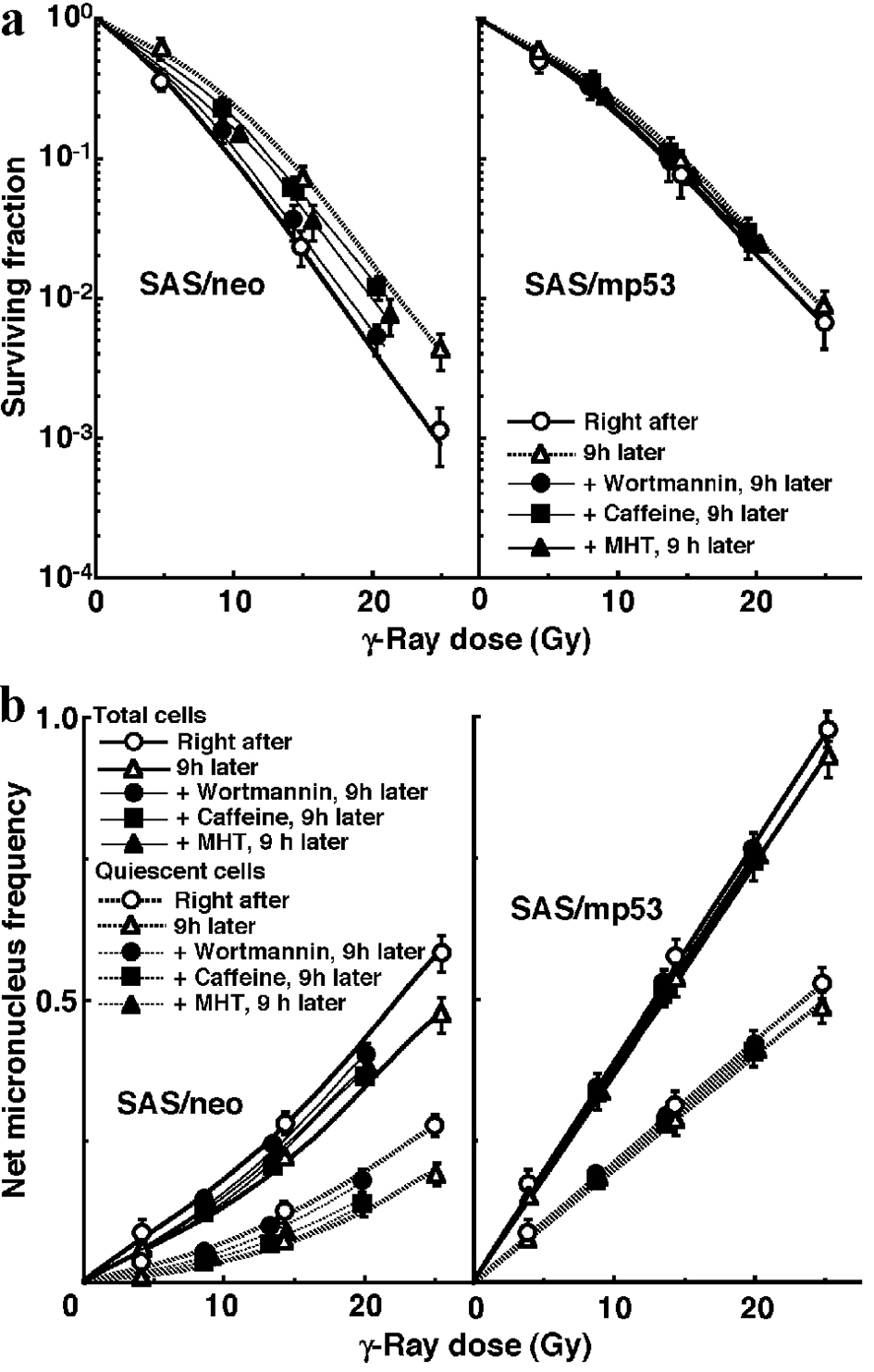 Table 1 shows the plating efficiencies for the total tumor cell population and the MN frequencies without γ-ray radiation for the total and Q tumor cell populations in each tumor. Overall, SAS/mp53 tumor cells showed significantly higher surviving fraction (SF) in the total tumor cell populations and significantly higher MN frequencies in both the total and Q tumor cell populations (P < 0.05). Further, Q tumor cells showed significantly higher MN frequencies than the total tumor cell population under each set of condition in each tumor (P < 0.05). Wortmannin and caffeine induced significantly lower plating efficiencies and significantly higher MN frequencies in both the total and Q tumor cell populations within each tumor than absolutely no treatment (P < 0.05). Furthermore, the values of the SF and the MN frequency for both drugs were almost the same. Thus, it follows that the dose of each drug employed here had an almost iso-effect in the absence of γ-ray irradiation. The combination with MHT caused slightly lower plating efficiency and slightly higher MN frequency in both populations than absolutely no treatment.