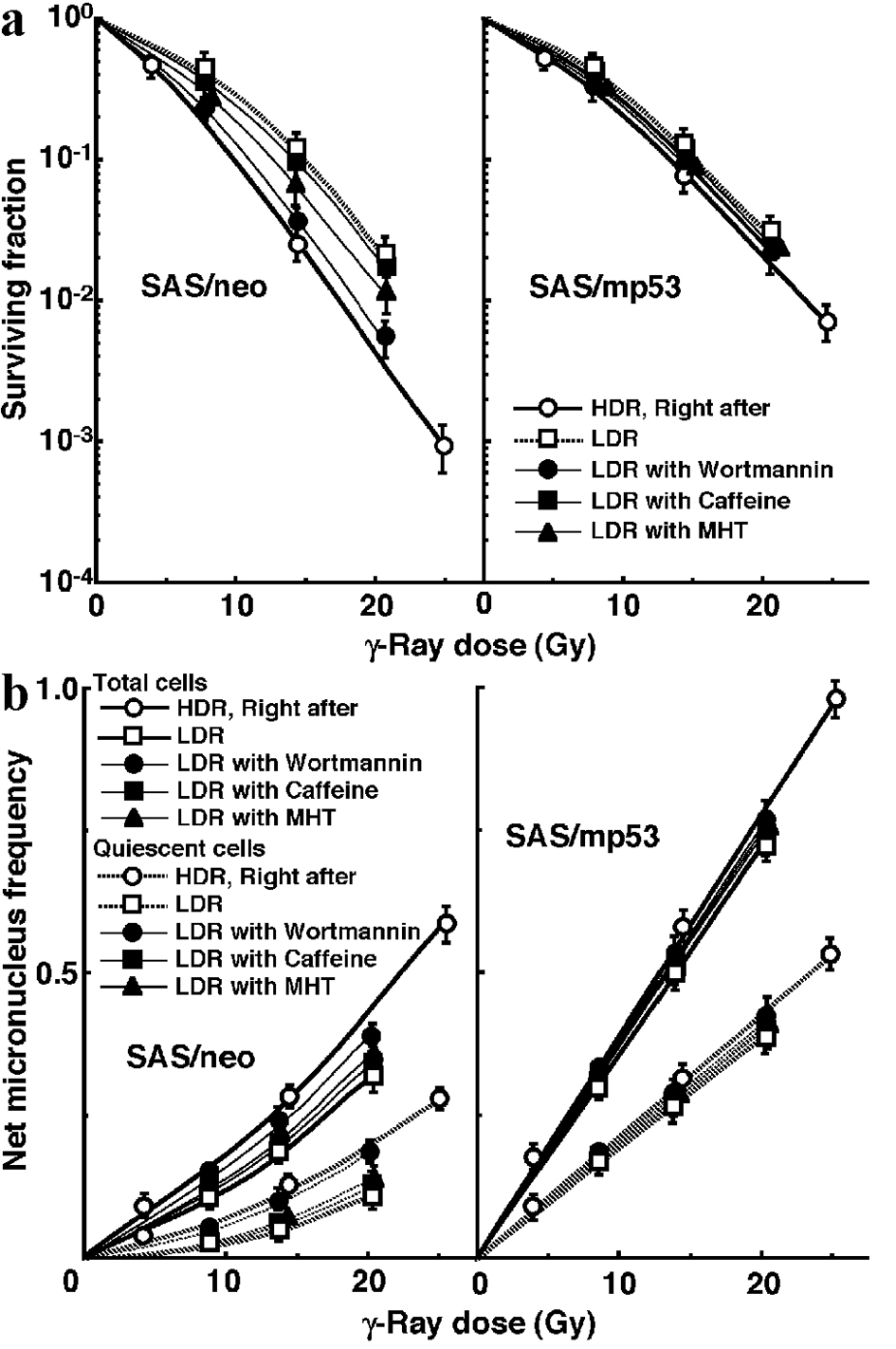 Methods: Human head and neck squamous cell carcinoma cells transfected with mutant TP53 (SAS/mp53) or with neo vector (SAS/neo) were injected subcutaneously into left hind legs of nude mice. Tumor-bearing mice received 5-bromo-2’-deoxyuridine (BrdU) continuously to label all intratumor proliferating (P) cells. They received high dose-rate γ-ray irradiation (HDR) immediately followed by localized MHT (40 °C for 2 h), or caffeine or wortmannin administration, or low dose-rate γ-ray irradiation simultaneously with localized MHT or caffeine or wortmannin administration. Nine hours after the start of irradiation, the tumor cells were isolated and incubated with a cytokinesis blocker, and the micronucleus (MN) frequency in cells without BrdU labeling (= Q cells) was determined using immunofluorescence staining for BrdU.