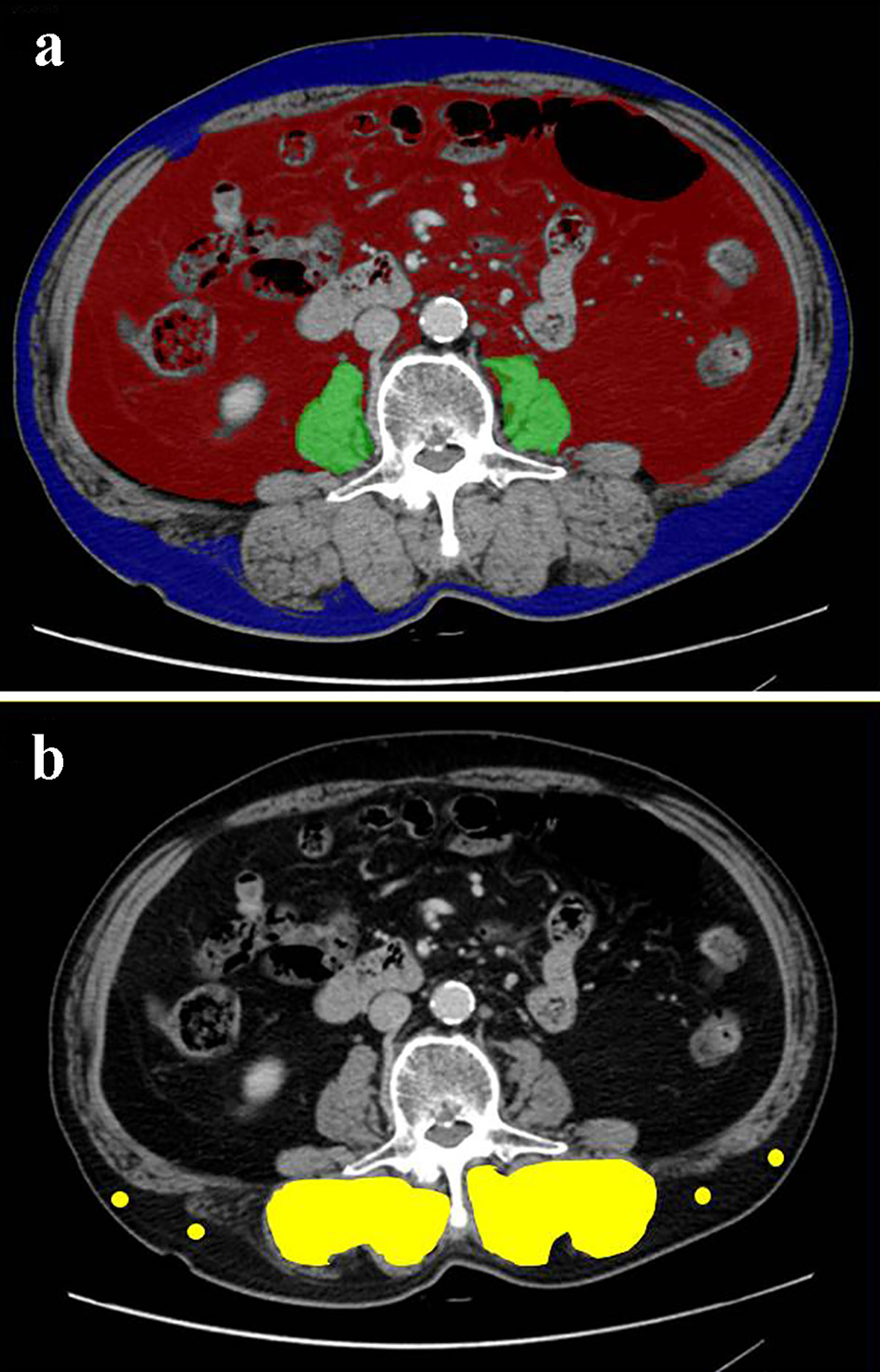 ![]() Click for large image | Figure 1. Cross-sectional CT images at the third lumber vertebra level of a 75-year-old male patient. (a) The areas of bilateral psoas muscles (green area), visceral (red) and subcutaneous (blue) adipose tissue area were identified. (b) The multifidus muscle (yellow area) was precisely traced. Four points (yellow dots) were placed on subcutaneous fat away from major vessels. CT: computed tomography. |