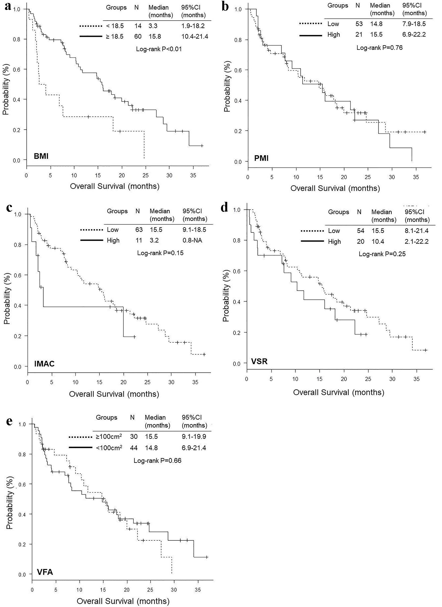 ![]() Click for large image | Figure 2. Kaplan-Meier curves of overall survival according to BMI (a), PMI (b), IMAC (c), VSR (d) and VFA (e). BMI: body mass index; PMI: psoas muscle index; IMAC: intramuscular adipose tissue content; VSR: visceral to subcutaneous adipose tissue area ratio; VFA: visceral fat area. |