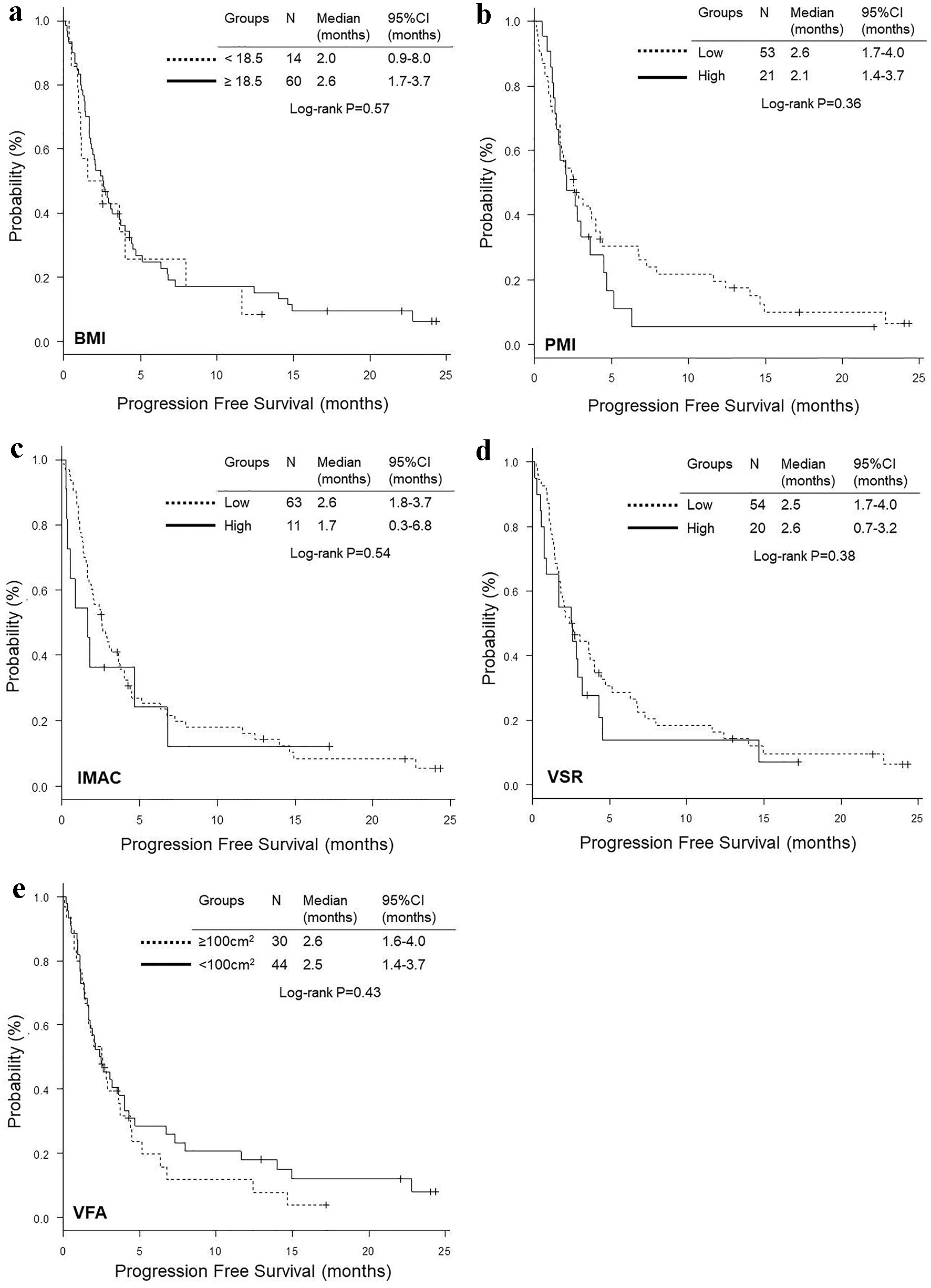 Suppl 2. Kaplan-Meier curves of progression-free survival according to BMI (a), PMI (c), IMAC (c), VSR (d) and VFA (e) in 70 ex-, current or unknown smokers without driver mutation (N = 70).