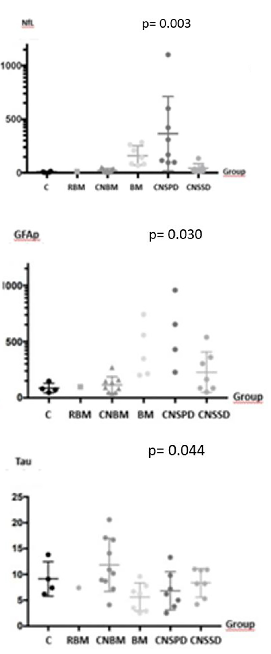 The sNfL, GFAp and tau concentrations in the control and in each clinical subgroup are shown in Table 3. The lowest sNfL median concentration in the study was found in the control group (7.2 pg/mL) and the highest in CNS tumors with progressive disease (239.0 pg/mL). The minimum and maximum median levels of GFAp followed the same pattern, with 74.5 pg/mL in C and 2,092.1 pg/mL in CNSPD. Differently, absolute tau levels did not differ much between groups, and the highest values were seen in CNBM (12.5 pg/mL).