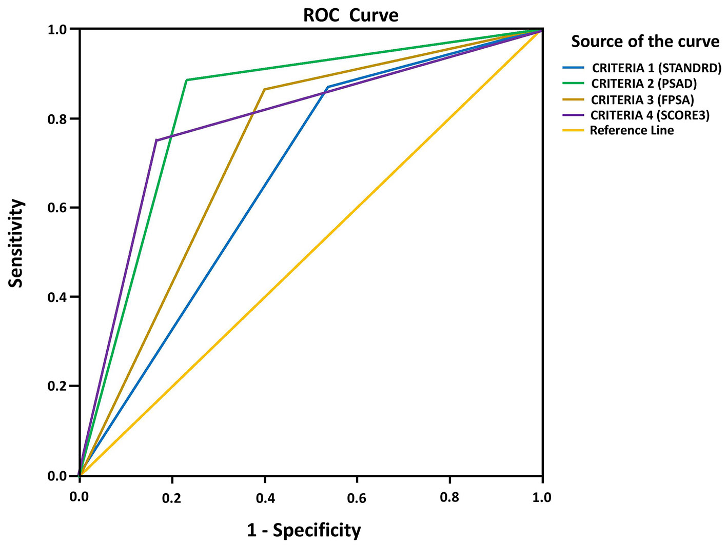 Results: In patients with CSPCa, significantly higher median age (P = 0.001), PSA level (P < 0.001), PSAD (P < 0.001) and significantly lower prostate volume (P < 0.001) and free PSA% were observed as compared to patients with non-CSPCa. Significantly higher proportion of patients with CSPCa showed PIRADS positive test compared to those with non-CSPCa (86.4% vs. 53.3%, P < 0.001). Cut-off values for PSAD and free PSA% were 0.12 ng/mL2 and 25%, respectively. Age, PSAD and free PSA% were significant predictors of PCa, while age and PSAD were significant predictors of CSPCa. Criteria 2, 3 and 4 demonstrated higher specificity and positive predictive value (PPV) in predicting CSPCa as compared to criterion 1. The overall accuracies of criterion 1, 2, 3 and 4 were 64.42%, 85.58%, 80.77% and 79.81%, respectively. The area under the curve (AUC) values of criterion 2, 3 and 4 were higher (0.827, 0.732 and 0.792) than criterion 1 (0.665).