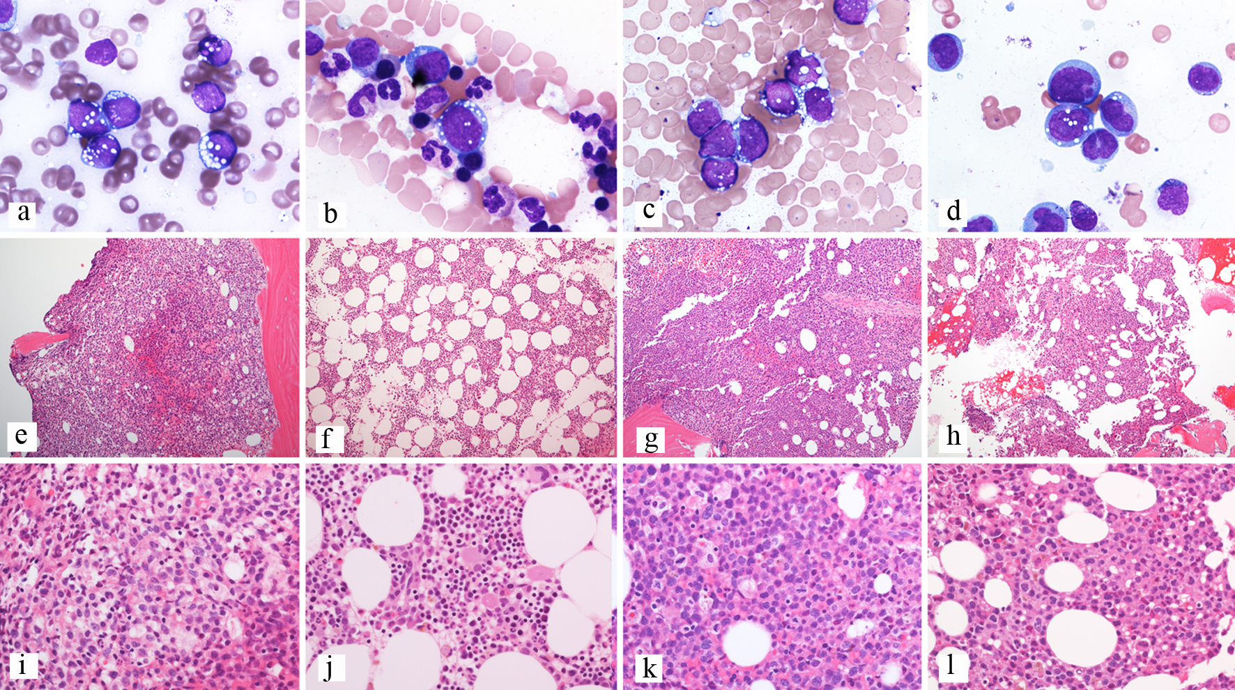 ![]() Click for large image | Figure 1. Composite of bone marrow biopsies from patient 3. (a, e, i) Bone marrow biopsy at diagnosis; (a) Aspirate showing blasts with cytoplasmic vacuoles, Wright-Giemsa stain, 100 × objective; (e) Trephine biopsy showing a hypercellular bone marrow, H&E-stained section, 10 × objective; (i) Trephine biopsy showing sheets of blasts, H&E-stained section, 40 × objective. (b, f, j) Bone marrow biopsy after enasidenib; (b) Aspirate showing rare erythroid precursors with cytoplasmic vacuoles and no definite blasts, Wright-Giemsa stain, 100 × objective; (f) Trephine biopsy showing a hypercellular bone marrow, H&E-stained section, 10 × objective; (j) Trephine biopsy showing trilineage hematopoiesis with erythroid hyperplasia, H&E-stained section, 40 × objective. (c, g, k) Bone marrow biopsy at relapse; (c) Aspirate showing blasts with cytoplasmic vacuoles, Wright-Giemsa stain, 100 × objective; (g) Trephine biopsy showing a hypercellular bone marrow, H&E-stained section, 10 × objective; (k) Trephine biopsy showing sheets of blasts, H&E-stained section, 40 × objective. (d, h, l) Bone marrow biopsy after enasidenib; (d) Aspirate showing blasts with partial differentiation and similar cytoplasmic vacuoles, Wright-Giemsa stain, 100 × objective; (h) Trephine biopsy showing a hypercellular bone marrow, H&E-stained section, 10 × objective; (l) Trephine biopsy showing sheets of immature cells, H&E-stained section, 40 × objective. H&E: hematoxylin and eosin. |