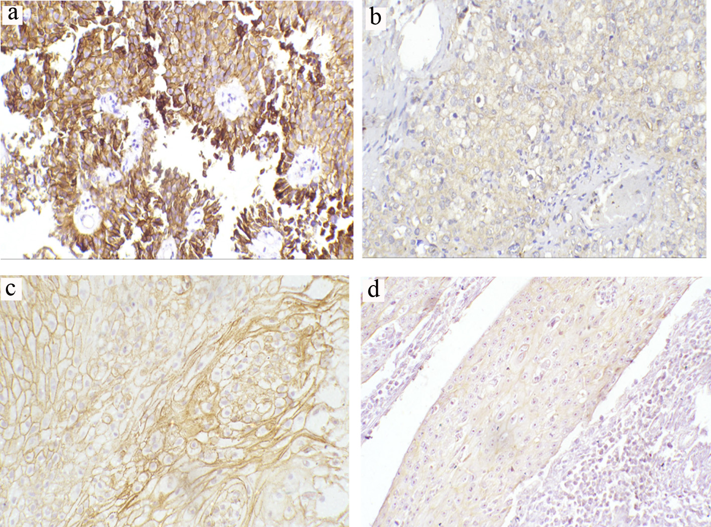 ![]() Click for large image | Figure 1. Representative immunohistochemical staining of E-cadherin in TCCs and SCCs (a-d) (magnification × 200). (a) Preserved normal positive membranous expression in low-grade non-muscle-invasive TCC. (b) Reduced membranous expression in high-grade invasive TCC. (c) Preserved normal positive membranous expression in moderately differentiated SCC. (d) Reduced membranous expression in poorly differentiated SCC. TCC: transitional cell carcinoma; SCC: squamous cell carcinoma. |