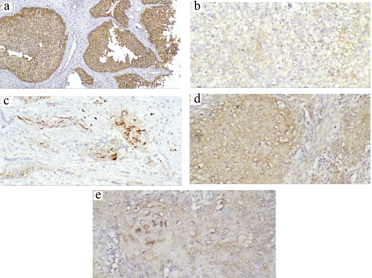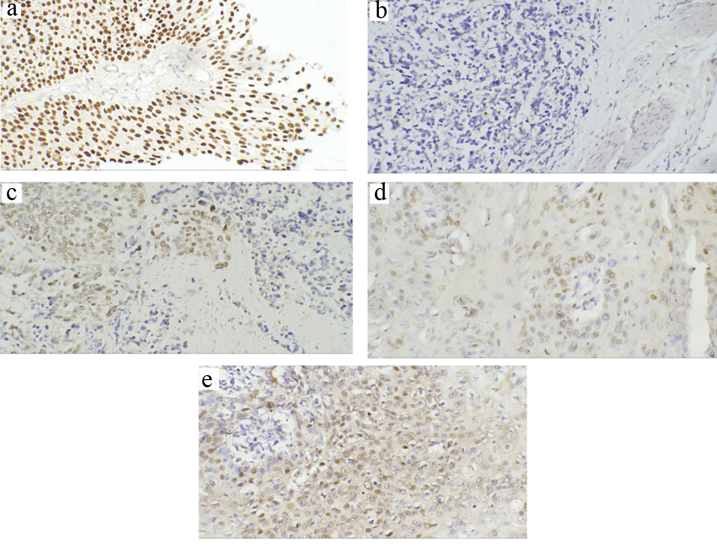 ![]() Click for large image | Figure 4. Representative immunohistochemical staining of p63 in TCCs and SCCs (a-e) (magnification × 200). (a) Strong staining of all cell layers in low-grade superficial TCC. (b) Loss of p63 expression in invasive TCC. (c) Some preserved positive p63 expression in invasive TCC. (d) Positive p63 in moderately differentiated SCC (G2) showing positivity in the cells of the basal layer. (e) Diffuse and high intense positivity for p63 in poorly differentiated SCC (G3). TCC: transitional cell carcinoma; SCC: squamous cell carcinoma. |
