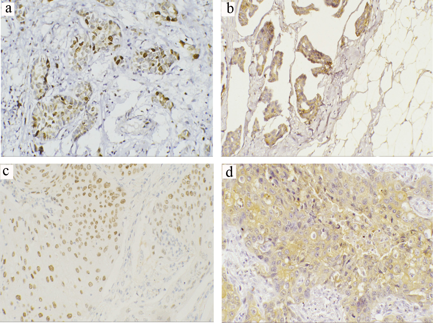 ![]() Click for large image | Figure 3. Representative immunohistochemical staining of ZEB1 and ZEB2 in TCCs and SCCs (a-d) (magnification × 200). (a) Positive ZEB1 nuclear expression in invasive TCC. (b) Positive ZEB2 cytoplasmic expression in invasive TCC. (c) Positive ZEB1 nuclear expression in invasive SCC. (d) Positive ZEB2 cytoplasmic expression in high-grade invasive SCC. TCC: transitional cell carcinoma; SCC: squamous cell carcinoma; ZEB: zinc-finger E-box-binding homeobox. |