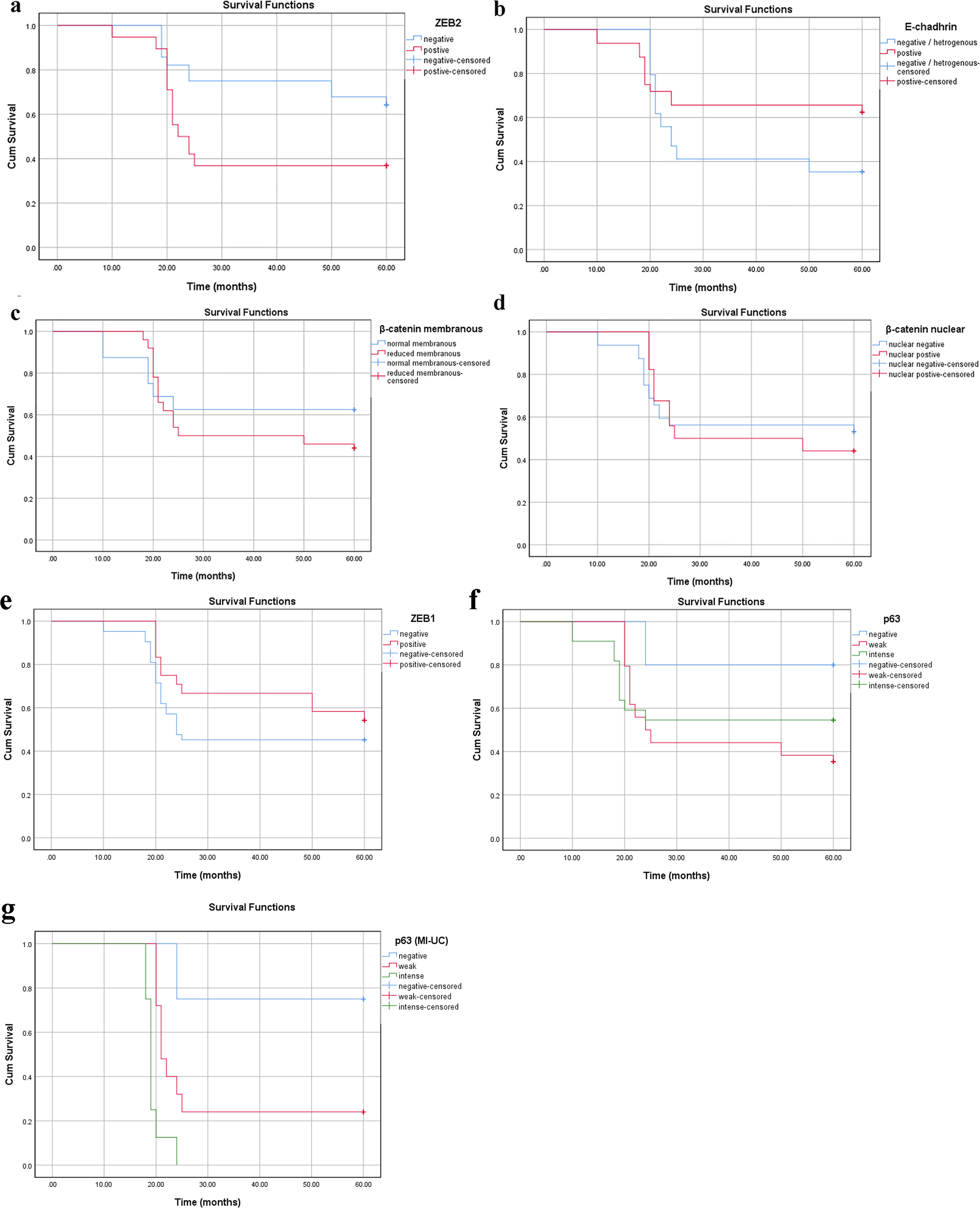 For TCC patients, the median follow-up was 55 months (range: 10 - 60). OS was 48.5%. Reduced E-cadherin expression was not significantly associated with the OS (P = 0.103). The lack of association was also true for high (intense) p63 expression (P = 0.09), nucleo-cytoplasmic/reduced membranous β-catenin expression (P = 0.8 and P = 0.284, respectively) as well as positive ZEB1 staining (P = 0.08). However, patients with ZEB2 positive tumors were more likely to die compared to those with negative ZEB2 (P = 0.024). The 5-year OS was 49.4 for patients with ZEB2-negative tumors compared to 34.9 in ZEB2-positive tumors (Fig. 5a-f). Interestingly, when confined to patients with MIBCs, an association was noticed between p63 high expression and poor OS; specifically, high (intense) p63 expression was associated with a significantly worse median OS of 19 months, whereas patients with lower levels of p63 had an improved median OS of 24 months (P < 0.001). Further, other markers did not show an association with OS (P > 0.05) (Fig. 5g).
