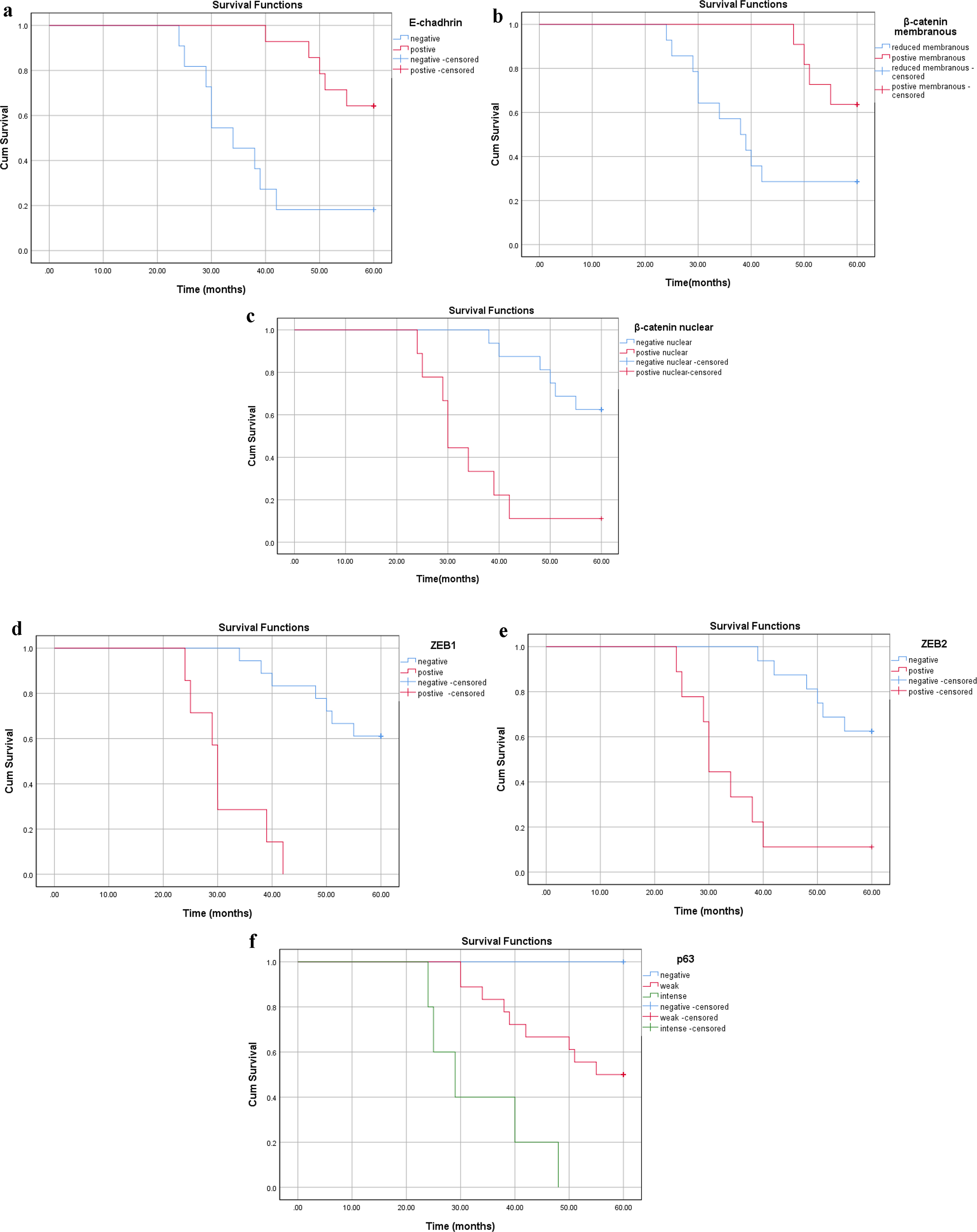 For SCC, the median follow-up was 51 months (range: 24 - 60). OS was 44% (n = 11). E-cadherin aberrant or absent immunoreactivity correlated with OS (P = 0.001, Fig. 6a). The OS was significantly poorer in patients with positive nucleo-cytoplasmic β-catenin/reduced membranous β-catenin, ZEB1 and ZEB2 positive cases as well patients with high (intense) p63 expression (P < 0.001, Fig. 6b-f).