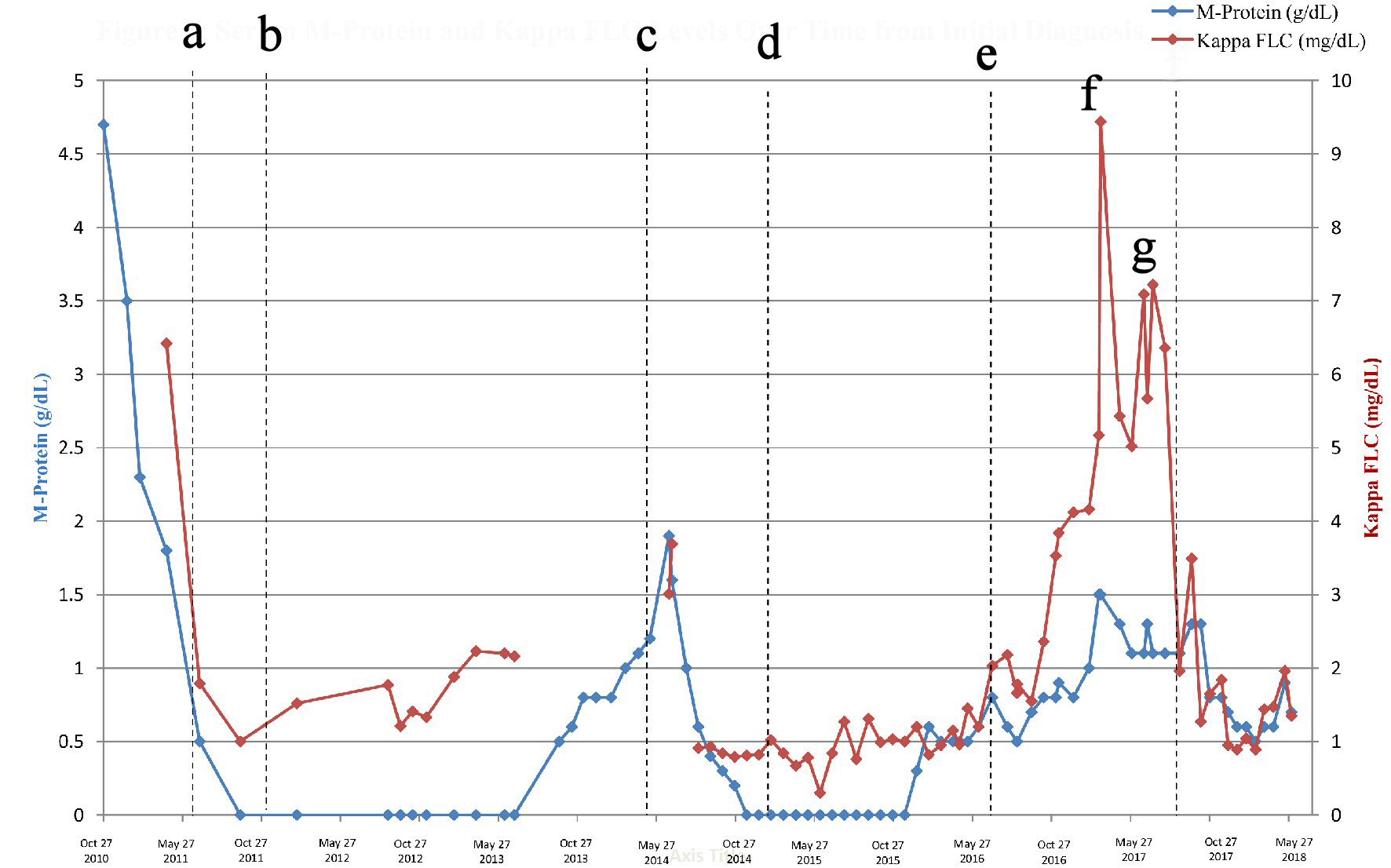 ![]() Click for large image | Figure 1. Serum M-protein and kappa FLC levels over time from initial diagnosis. a: Induction therapy: lenalidomide (25 mg); dexamethasone (40 mg); and added bortezomib (1.3 mg/m2) in April 2011. b: Stem cell collection and AHCT, resulting in a VGPR. c: Maintenance therapy with lenalidomide (15 mg, days 1 - 21), 28-day cycles, resulted in remission. d: First relapse: treatment with RVd (lenalidomide 15 mg, bortezomib 1.3 mg/m2, dexamethasone 40 mg). e: Maintenance therapy with bortezomib 1.3 mg/m2, added dexamethasone (40 mg) on days of bortezomib dosing in January 2016. f: Second relapse. The following treatments were tried and failed: Rvd, ixazomib monotherapy, ixazomib + lenalidomide, elotuzumab + Rd. g: Treatment with nelfinavir, elotuzumab, bortezomib, and dexamethasone of 21-day cycles started on Aug 8, 2017. FLC: free light chains; AHCT: autologous hematopoietic cell transplant; VGPR: very good partial response; RVd: lenalidomide, bortezomib, dexamethasone; Rd: lenalidomide and dexamethasone. |