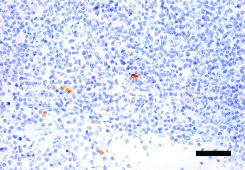 ![]() Click for large image | Figure 1. Tonsil specimen immunostained for p16. FFPE section from a tonsil scored negative for p16, with few focally positive stained cells. Magnification bar = 50 µm. FFPE: formalin fixed paraffin embedded. |