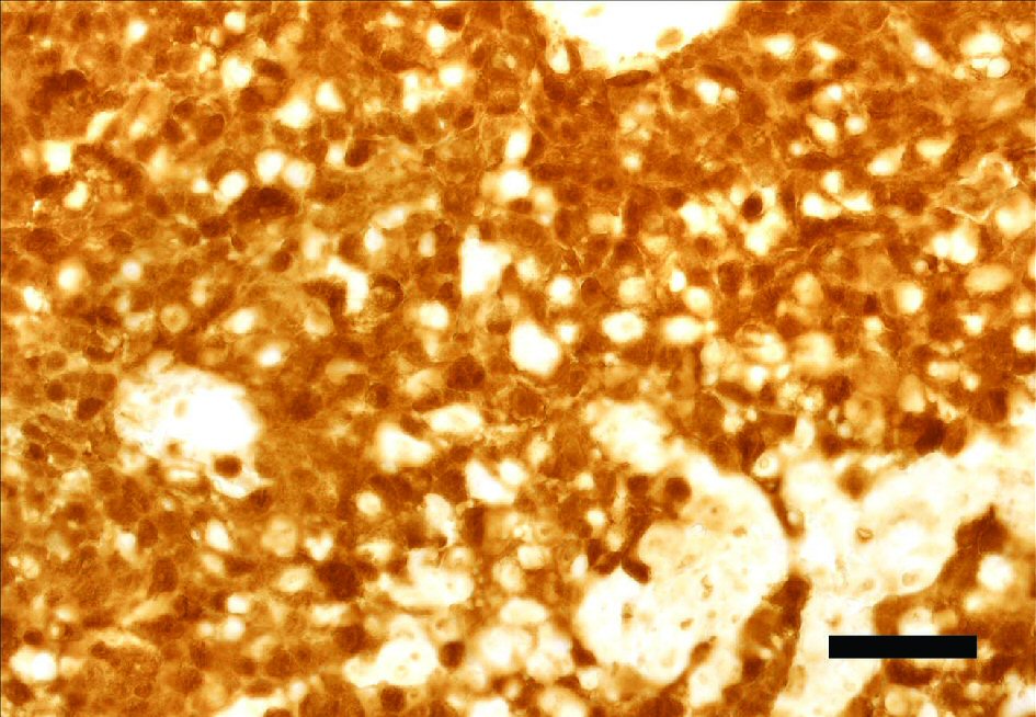 ![]() Click for large image | Figure 2. Base of the tongue specimen immunostained for p16. FFPE section from the base of the tongue scored positive for p16, with greater than 70% of nuclei and cytoplasm of tumor cells stained positive. Magnification bar = 50 µm. FFPE: formalin fixed paraffin embedded. |