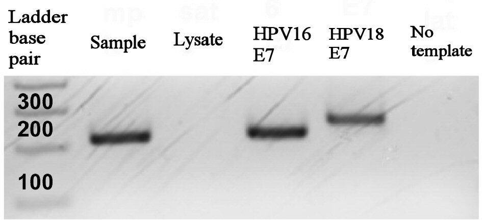 ![]() Click for large image | Figure 3. Gel electrophoresis of HPV16 E7 and HPV18 E7 PCR amplicons. Indicated samples were electrophoresed with a 100 base pair amplicon sizing ladder on a 2% agarose gel containing ethidium bromide. HPV: human papillomavirus; PCR: polymerase chain reaction. |